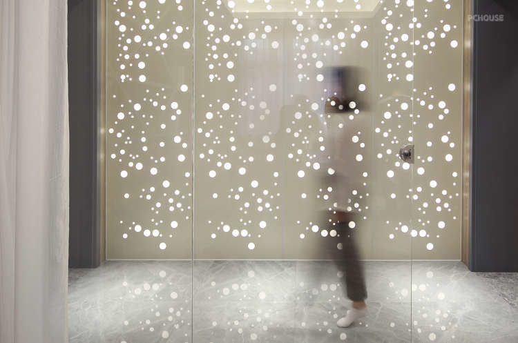 走廊左侧是书房,另一侧是主卧的大衣帽间,走廊右侧的墙面采用木板墙内藏灯带,在透光孔的穿梭下映射到书房玻璃门上,光与影的结合让整个走廊如同仙境。