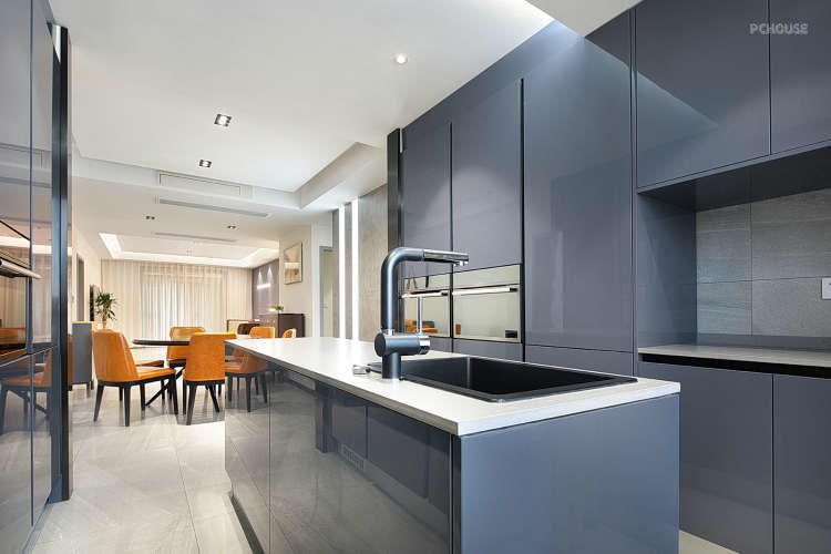 整个西厨看起来高端大气上档次,中岛式的操作台,有大量的操作空间。灰色亮光烤漆的配色搭配白色石英石的台面,看起来简洁又美观。两侧的柜子都是采用定做的,里面内嵌了洗碗机,冰箱,烤箱和微波炉,节省了大量空间,同时还非常美观。都是采用亮光烤漆面,因此不用采光问题,灯一开,整个厨房都闪闪发亮。