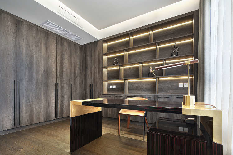 书房采用纯木元素打造。后面的装饰墙可以放书和照片之类的。桌子的配色采用金色和棕色,大气又奢华,台灯是采用固定,固定在桌子上。右边用了定制的大型储物柜。家中还常备了空调和暖气,不管冬天还是夏天,四季如春。