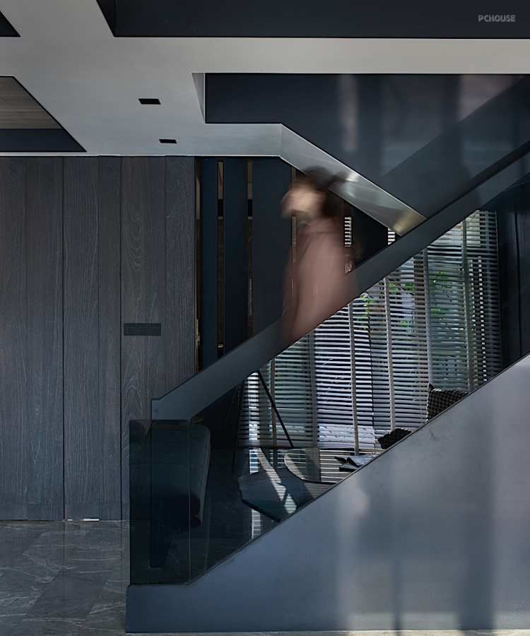楼梯摒弃传统的处理手法,扶手采用简洁的灰蓝色钢,沉稳而内敛,与主人的严谨作风相辅相成。大块面的石材贯穿三层,空间的延续性得到很好地保证。从高处俯瞰下方,整个空间既像一个厚实的臂膀,又似一处港湾,心灵得到栖息。