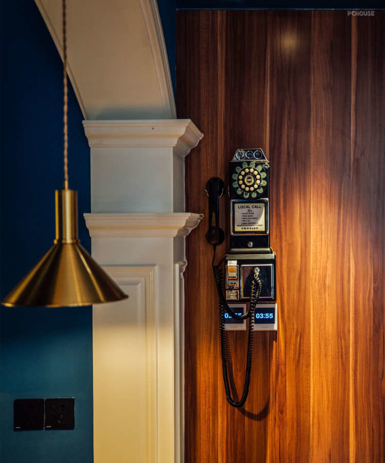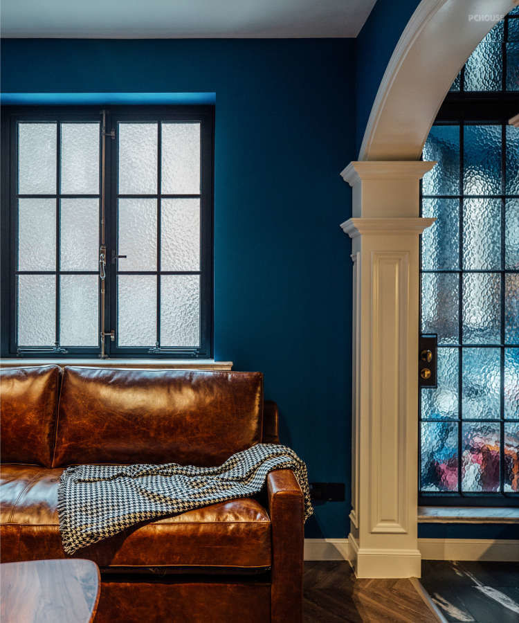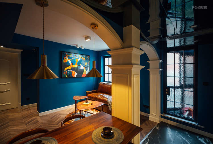 用白色混水木作打造的两道拱,在整体深蓝调的映衬下显得格外抢眼,搭配做旧皮沙发,黑胡桃柜体,水波纹钢窗,以及灰橡鱼骨地板,格调高级又别致。整个大厅虽然只有20平,融合了客,餐,厨三大空间,却一点不显拥挤。