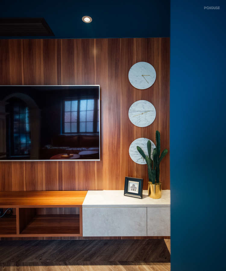 电视机墙采用开架与抽屉的拼色设计,实用又漂亮。