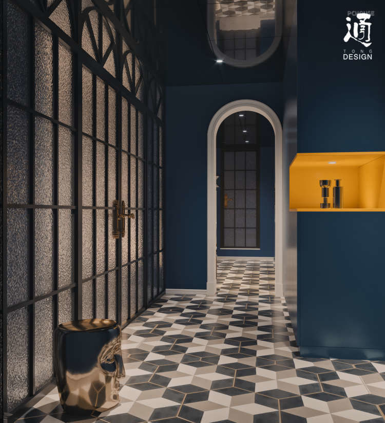 入户门厅与主卧之间,选用了老上海风情的玻璃门,光线穿透玻璃的光感很棒。整个玄关的调子设计的比较暗,顶部采用黑色镜面不锈钢处理,是想给业主带来每天工作回家一种安静惬意之感,也为客餐大空间先抑后扬做些铺地。
