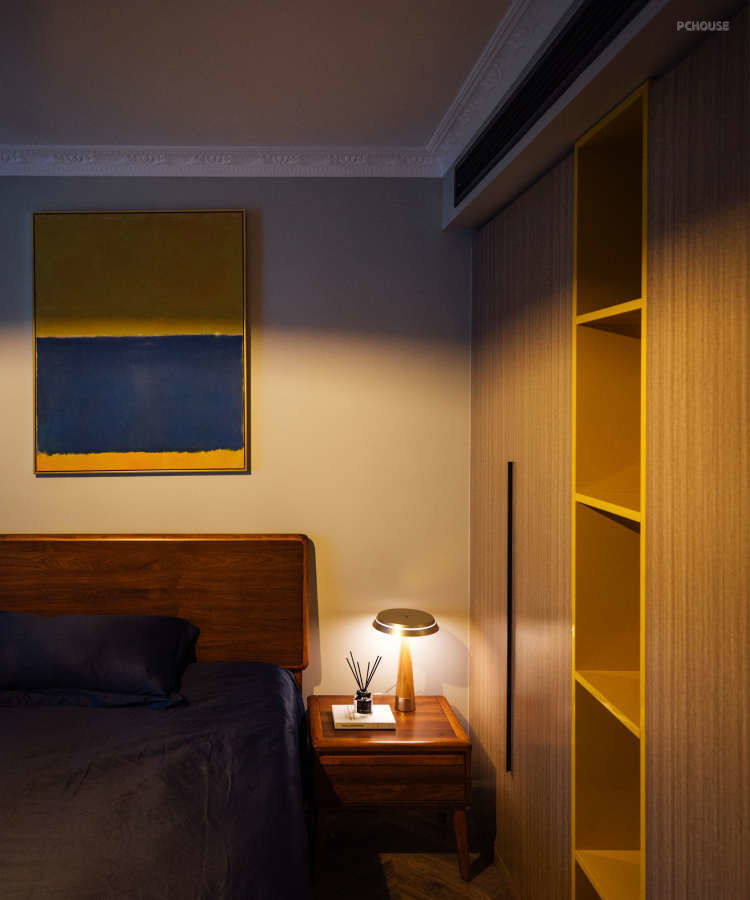 次卧是老人房,和主卧一样选择灰色调,区别于公共空间。#卧室#灰色#黄色#收纳#小户型#衣柜#装饰画#床#床头柜