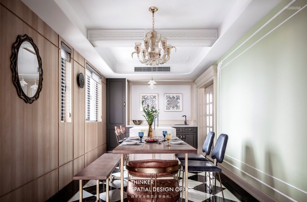 中厨,西厨和餐厅有机地连接在一起,优化生活动线。雅士白岛台,原木餐桌,浅色木饰面,清新绿色墙面,一半现代,一半法式,起承转合着复古之美与现代轻奢的时尚腔调。一席长宴,即一件不菲的生活艺术品,凝聚着温暖与情感。