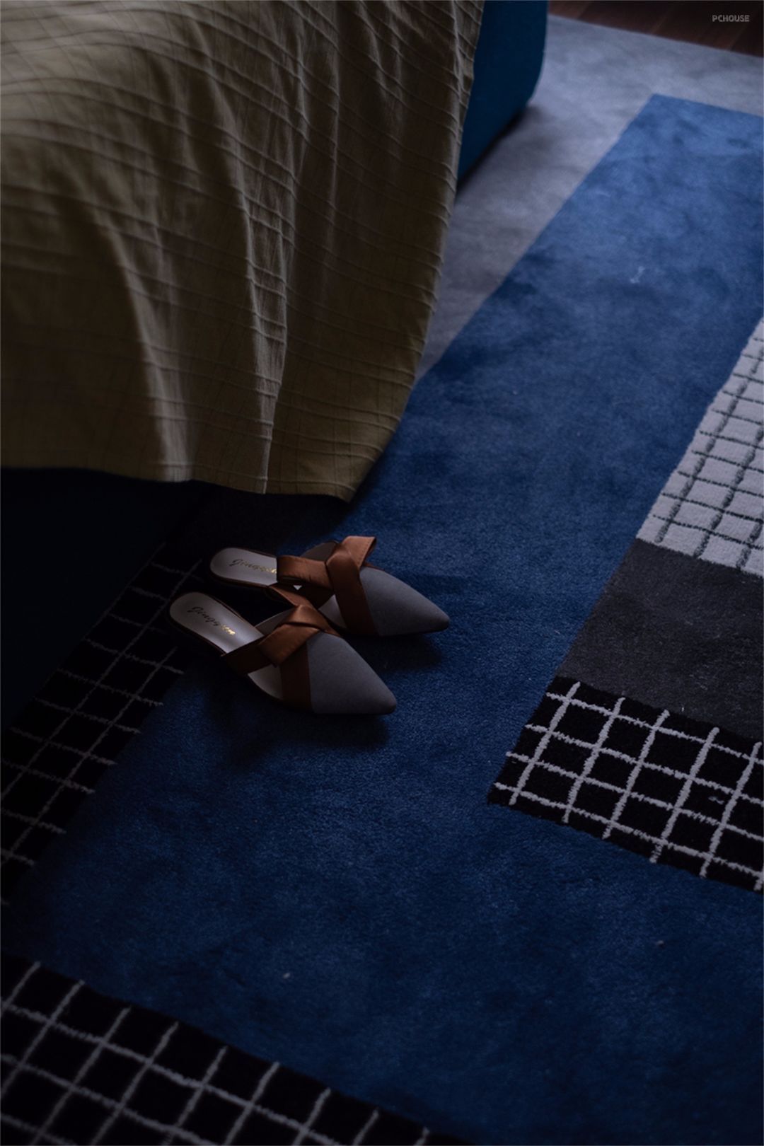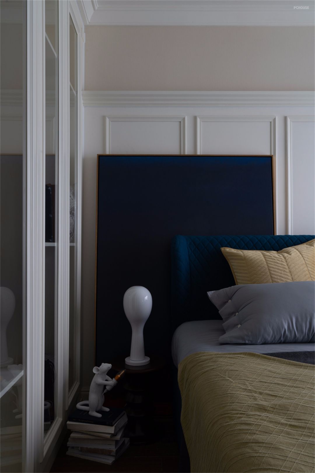 撞色对比的手法一直延伸到主卧中,蓝色清冷、黄色温润,两种全然不同的色彩感受碰撞出和谐的火花。不经想象有某个不上班的早晨,大家醒来心照不宣地不愿意拉开窗帘,生怕明亮的阳光打扰了这一刻的宁静。