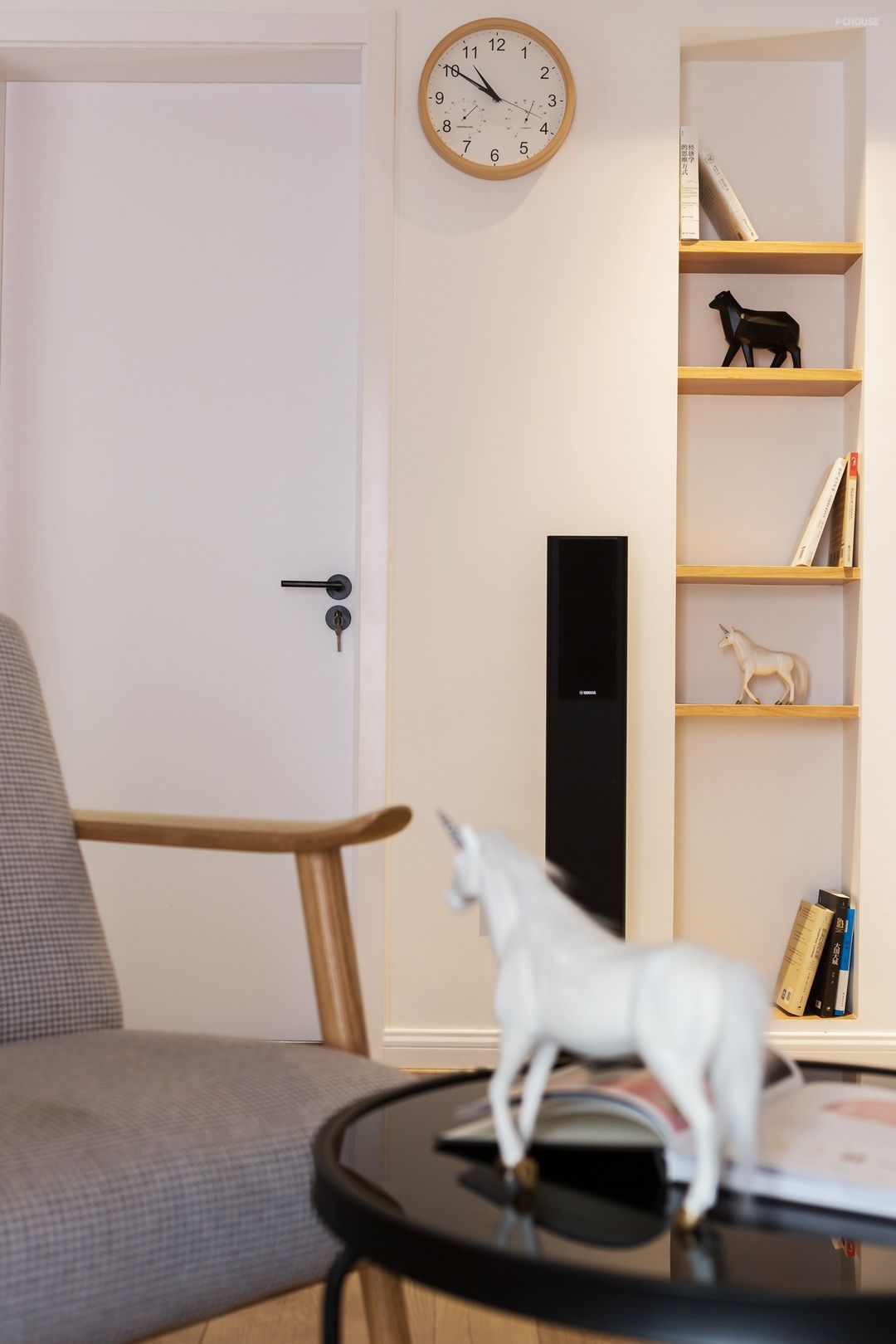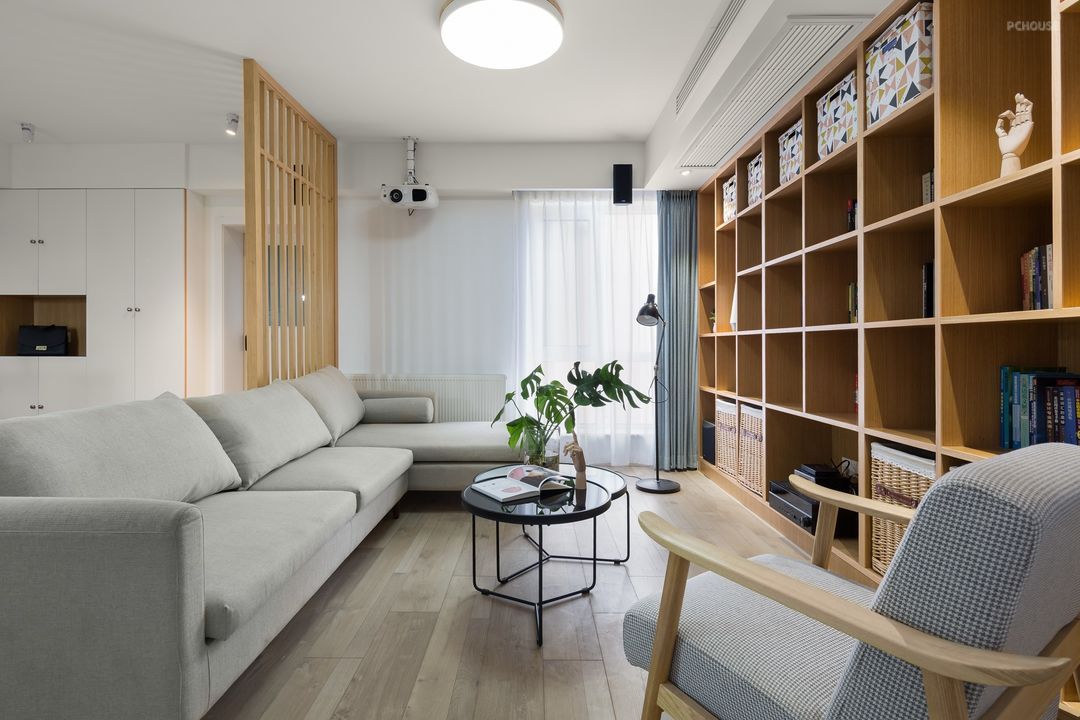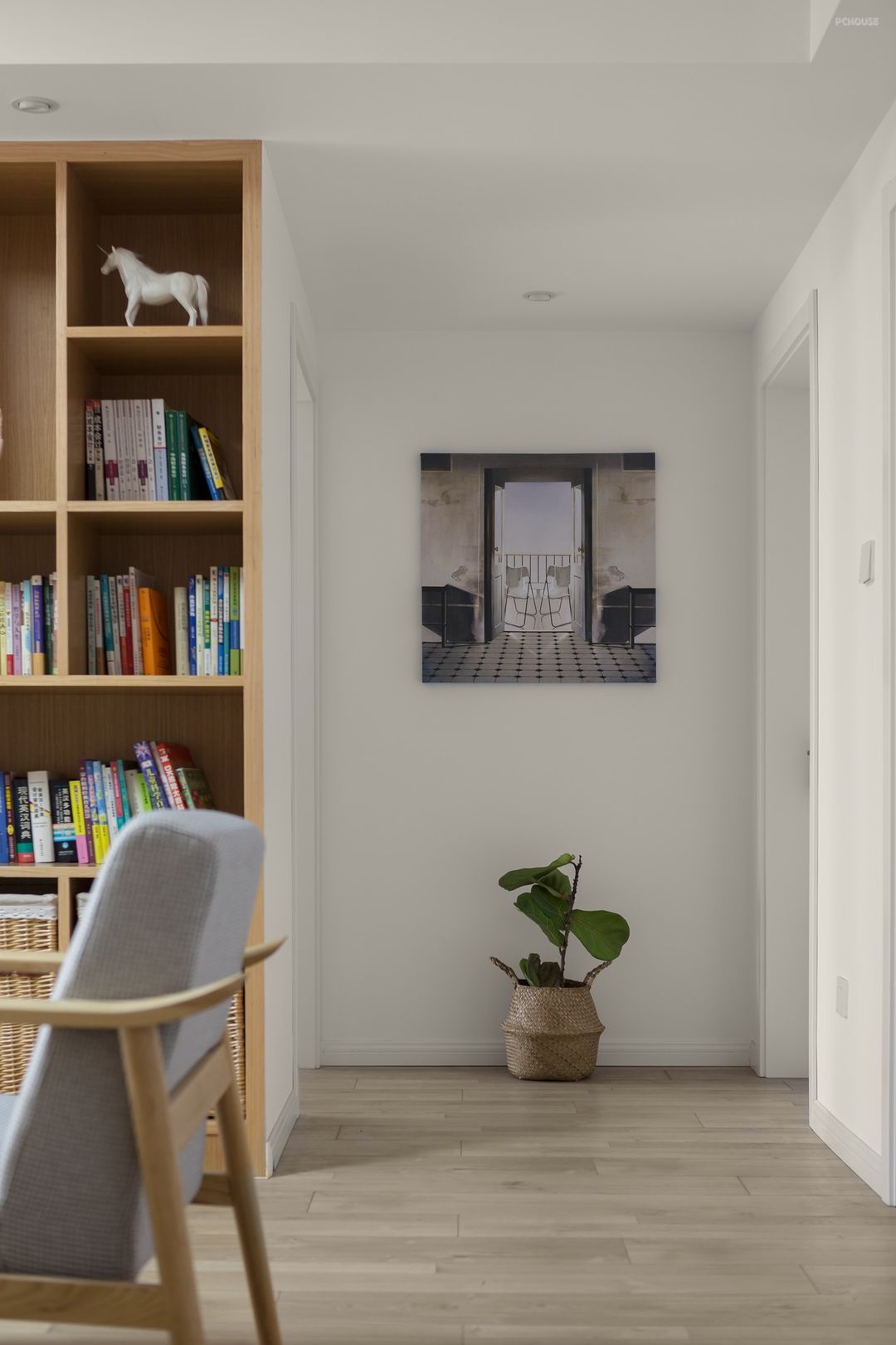 一整面墙的敞开式书柜,同时也把影音设备收纳其中,也满足了男业主一直以来的满墙书柜的愿望,生活在梦想中的房子里,爱人在侧,这就是美满的生活吧!