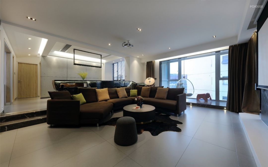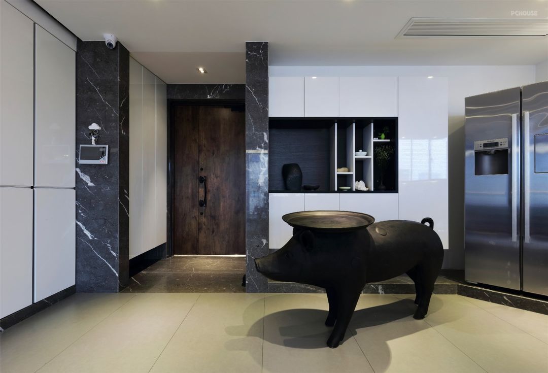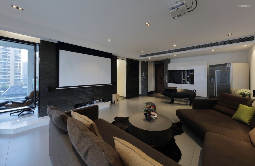 整个空间一眼望去,宽阔明净。客厅背景墙,分明的黑白与中性色的搭配,稳重而富有质感。
