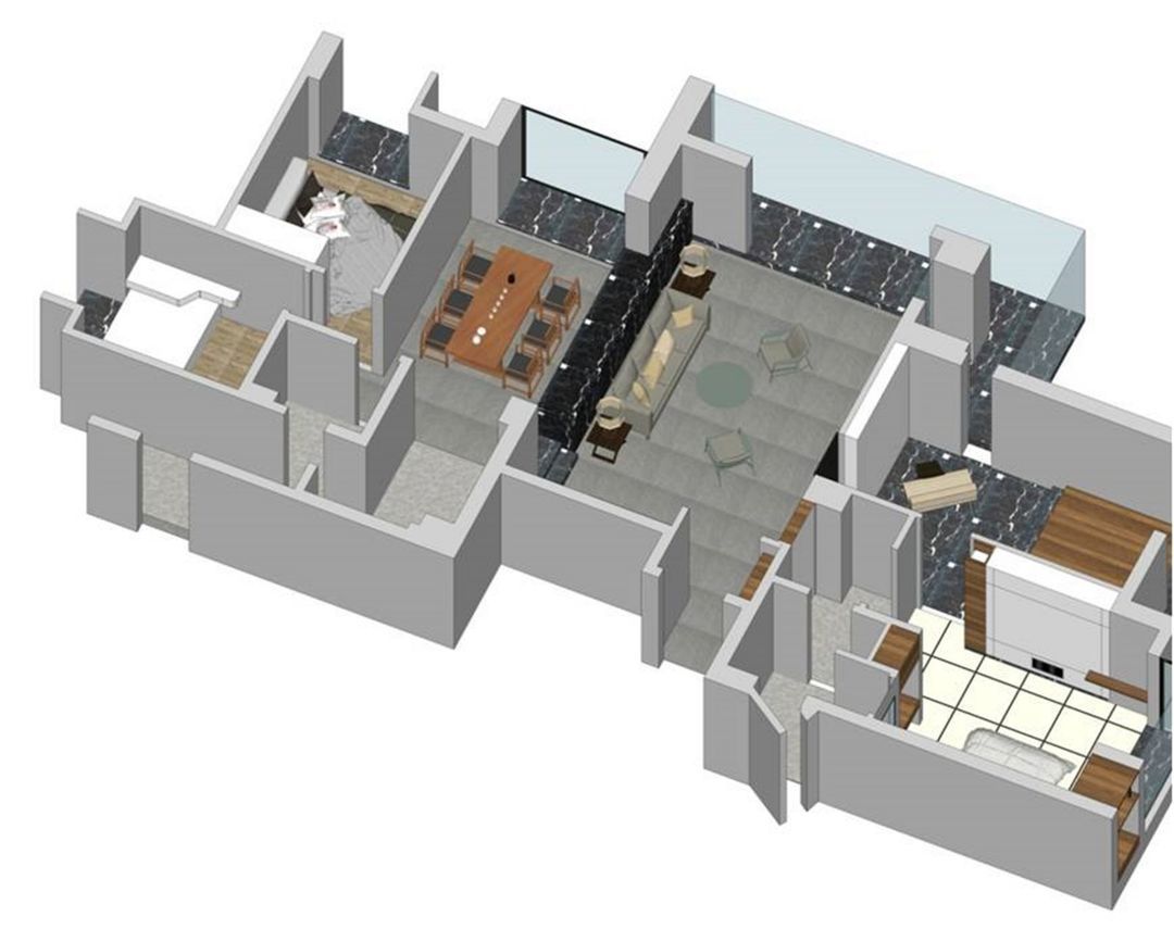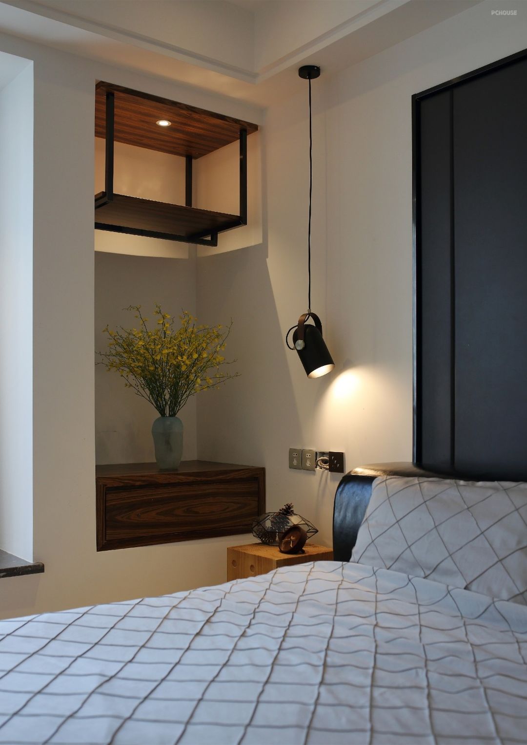 纯黑水泥板的大胆运用,做了可移动设计,既充当电视背景墙的功能,又兼具隐藏空间的功能,在视觉上增强空间的节奏感,也为空间添上了一抹神秘感。