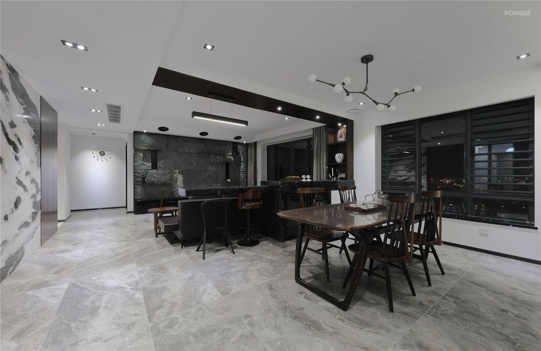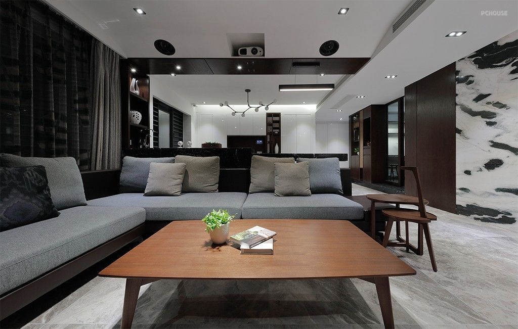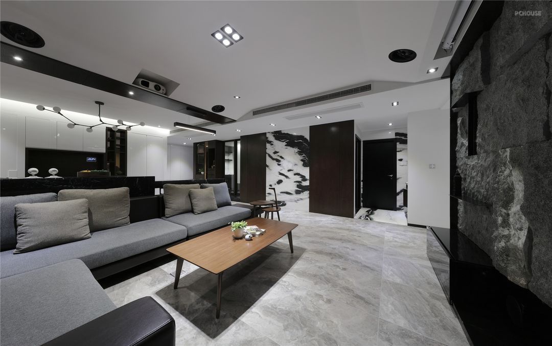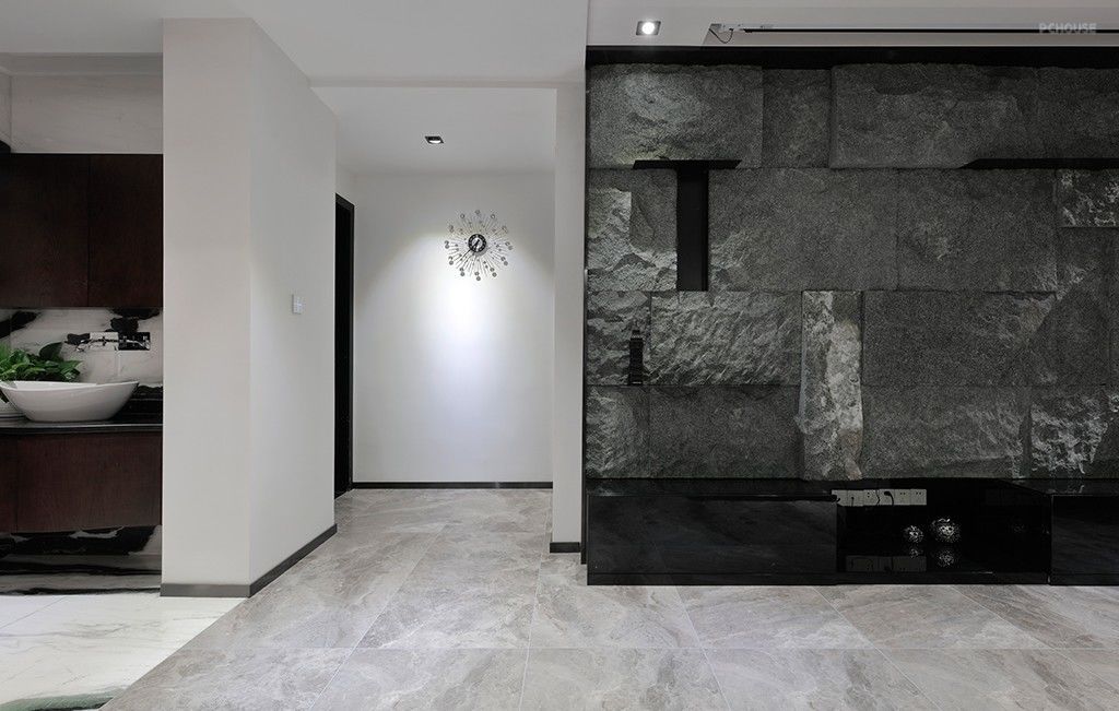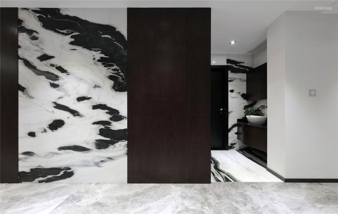 客厅糅合自然与经典现代元素于一体,选用天然材质的毛石作为电视背景墙,结合熊猫白大理石的优雅与时尚之意境,浅灰色纹理的地面瓷砖与高级黑达卡拉大理石台面,统一色调的窗帘与沙发布料,整体色彩搭配细腻,纹理丰富变换, 营造出一种似摄影作品又似画作的迷离美感。