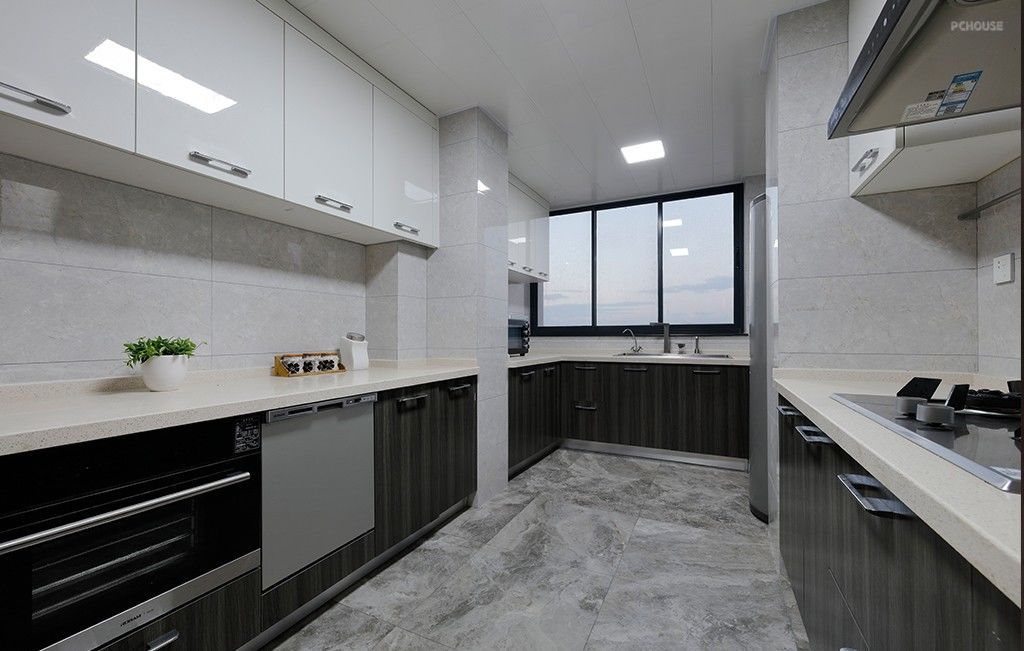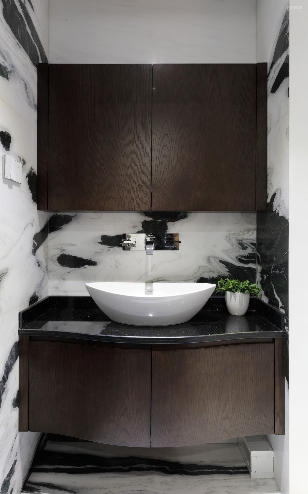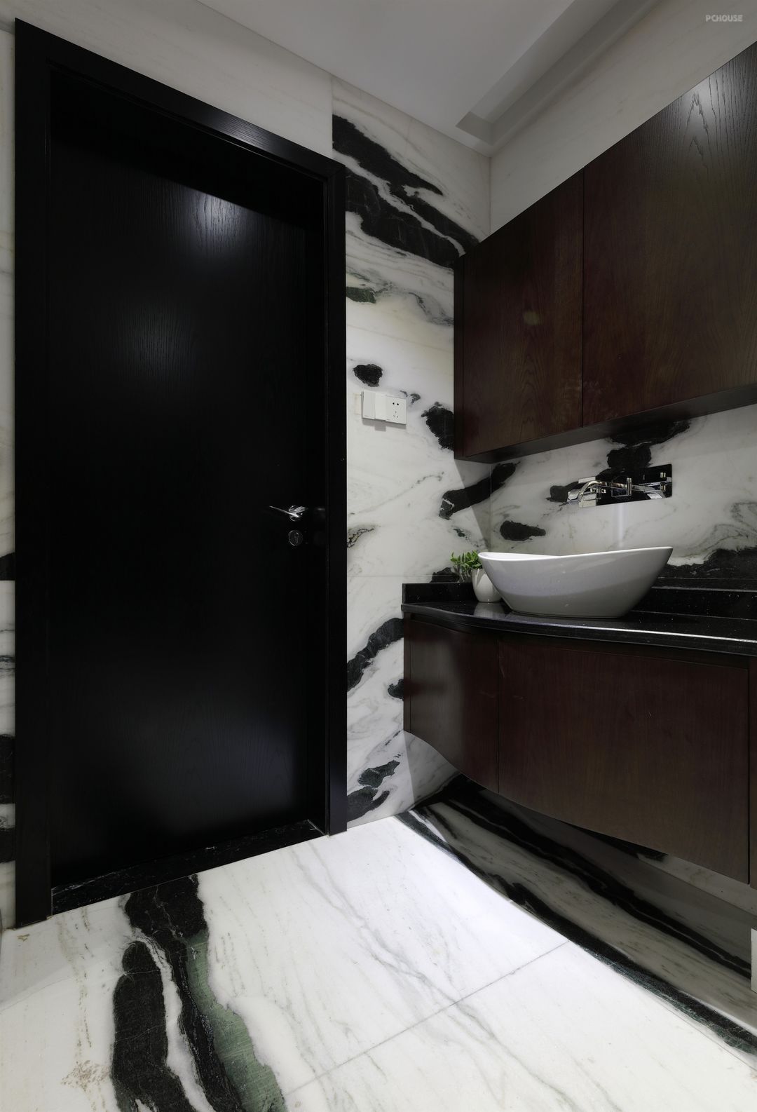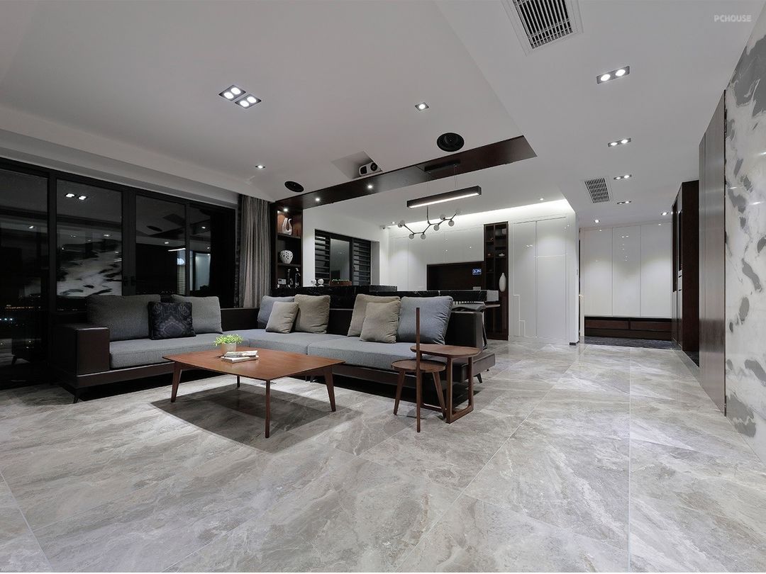 客厅糅合自然与经典现代元素于一体,选用天然材质的毛石作为电视背景墙,结合熊猫白大理石的优雅与时尚之意境,浅灰色纹理的地面瓷砖与高级黑达卡拉大理石台面,统一色调的窗帘与沙发布料,整体色彩搭配细腻,纹理丰富变换, 营造出一种似摄影作品又似画作的迷离美感。