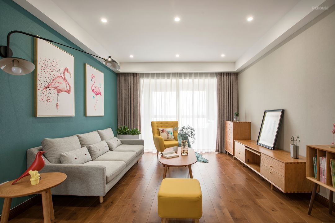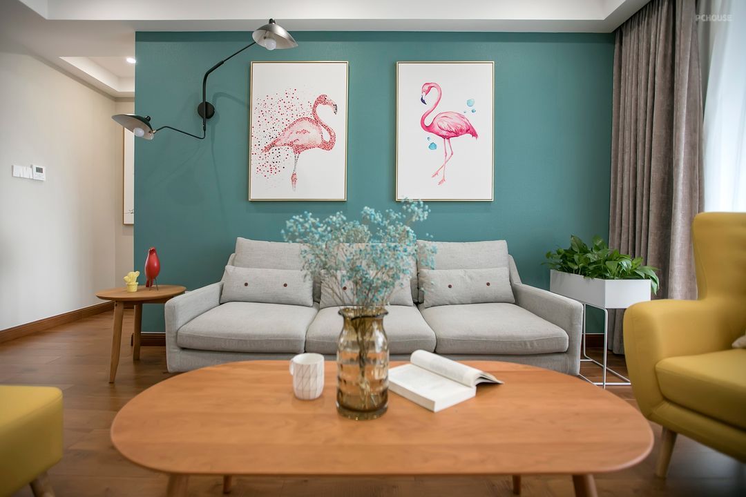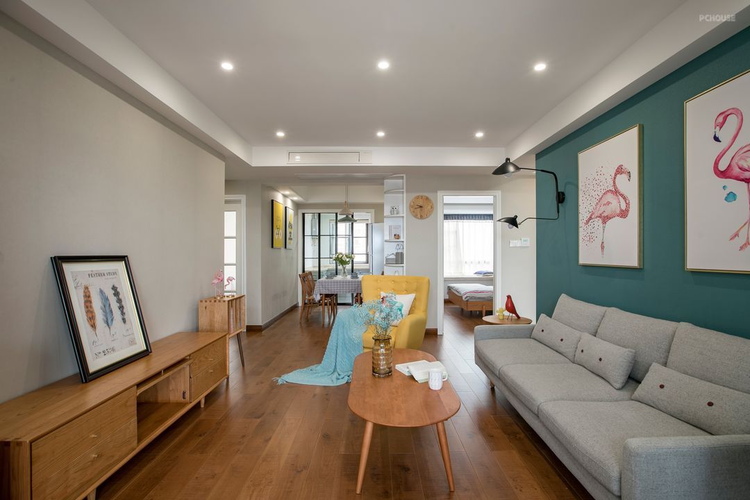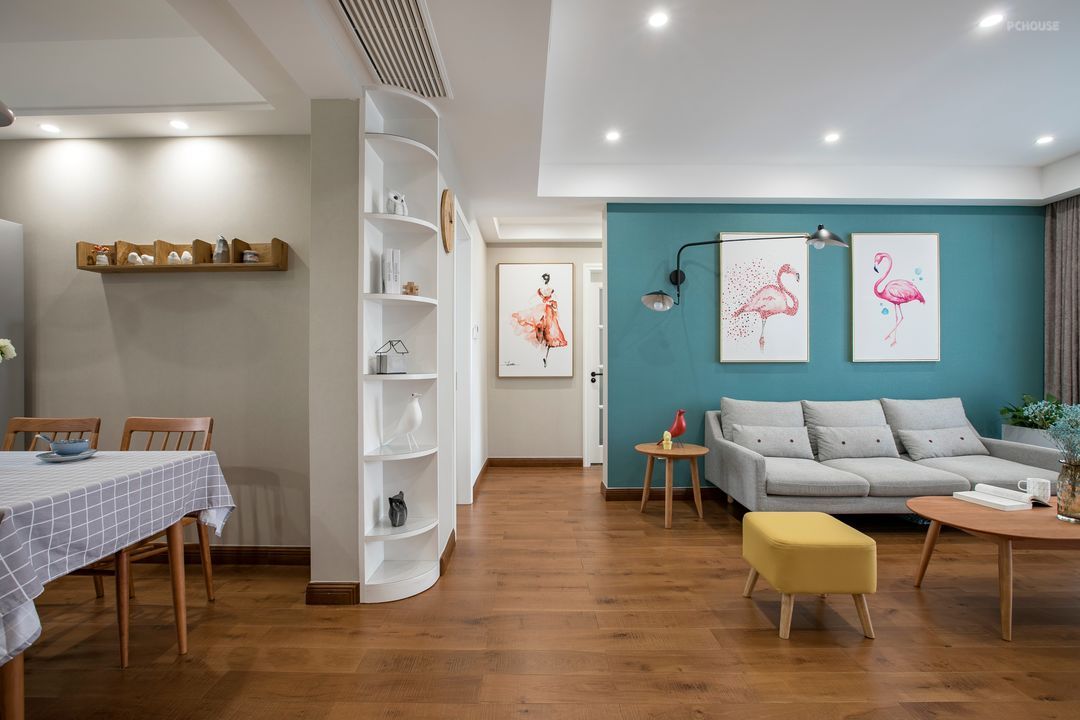 清新的淡蓝色背景墙,搭配两副高颜值装饰画,优雅柔和的粉色成为蓝色背景墙的点缀。米白色的三人沙发搭配黄色的单人沙发和原木色茶几,自然清新,也不失活力。浅灰色的电视背景墙,没有过多的修饰,搭配电视柜,书柜、斗柜,简洁又实用。小书柜的做工精致美观,配上火烈鸟的摆件,尽显优雅之气。入门正对这过道,视觉尽头的装饰画,回家应该放下一切烦恼,尽享与家人在一起的美好。