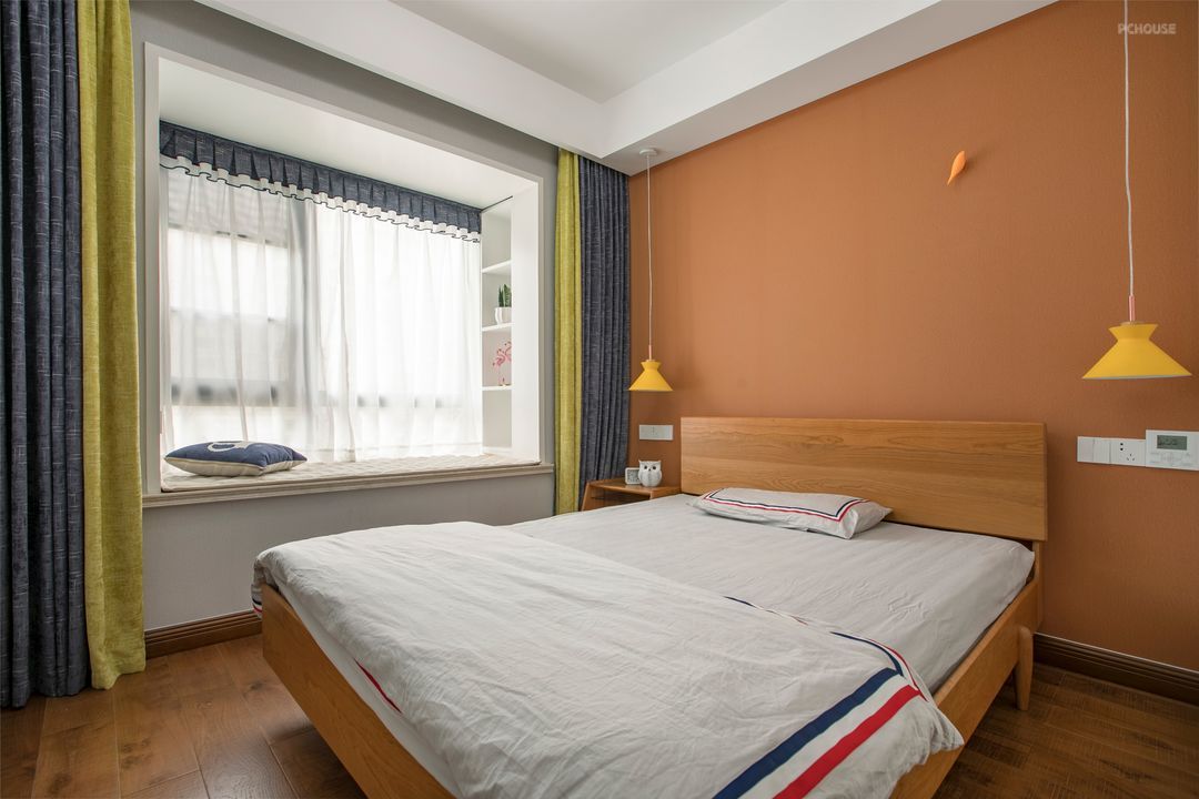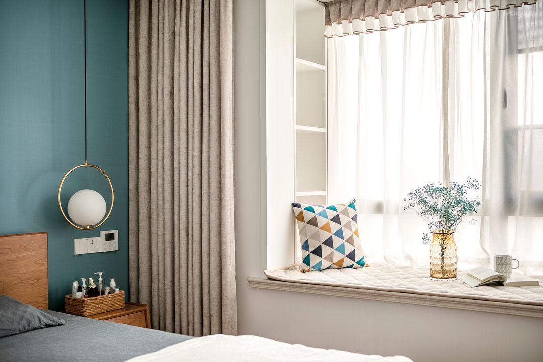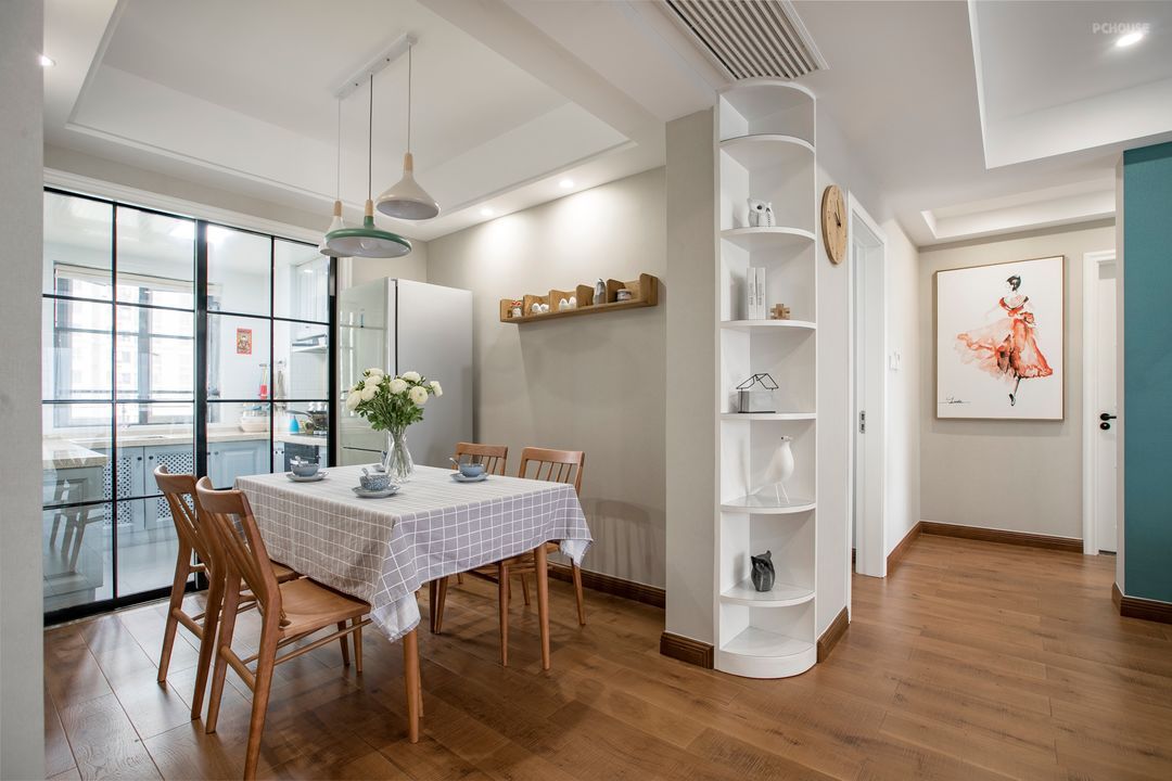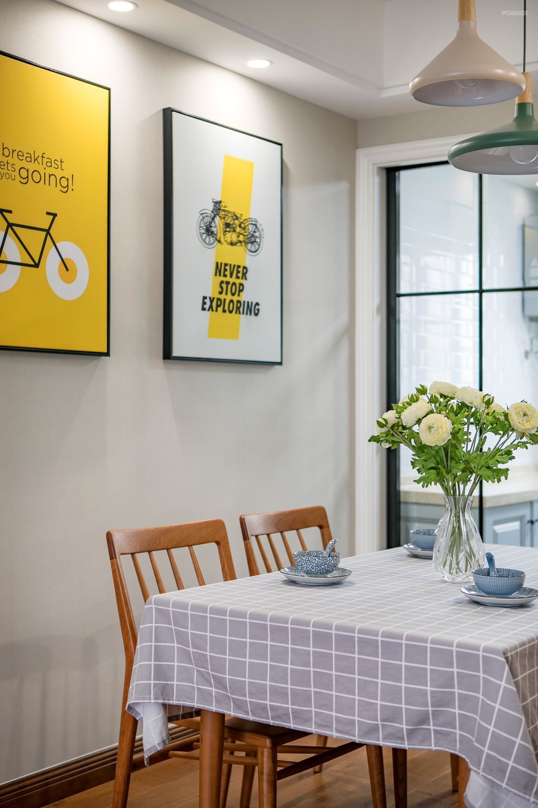 清新的淡蓝色背景墙,搭配两副高颜值装饰画,优雅柔和的粉色成为蓝色背景墙的点缀。米白色的三人沙发搭配黄色的单人沙发和原木色茶几,自然清新,也不失活力。浅灰色的电视背景墙,没有过多的修饰,搭配电视柜,书柜、斗柜,简洁又实用。小书柜的做工精致美观,配上火烈鸟的摆件,尽显优雅之气。入门正对这过道,视觉尽头的装饰画,回家应该放下一切烦恼,尽享与家人在一起的美好。