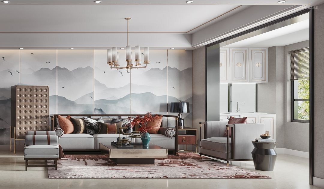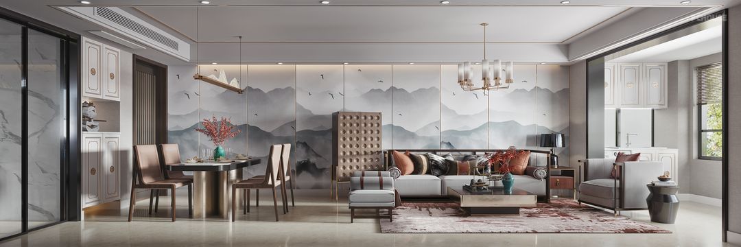 前言: 业主是一对从事飞行事业的夫妻,沟通过程中比较喜欢新中式,而这次的设计因为户型的原因所以我选择把整个一面餐厅 玄关 到客厅沙发背景做了一个整体的延伸,其实我觉得每一位飞行员应该都是一个勇者,每一次飞行都是工作大于欣赏,所以希望这样一整幅大背景让业主回来就可以放松心情,让自己翱翔于天际,而古色古香的中式韵味可以让人马上清静下来,静享时光的美好。
