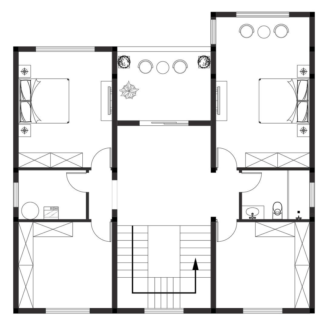 翻建后的房屋结构采用是砖混结构,楼梯采用三折步式,二楼做了套间处理,有独立的卧室、衣帽间、卫生间和书房。