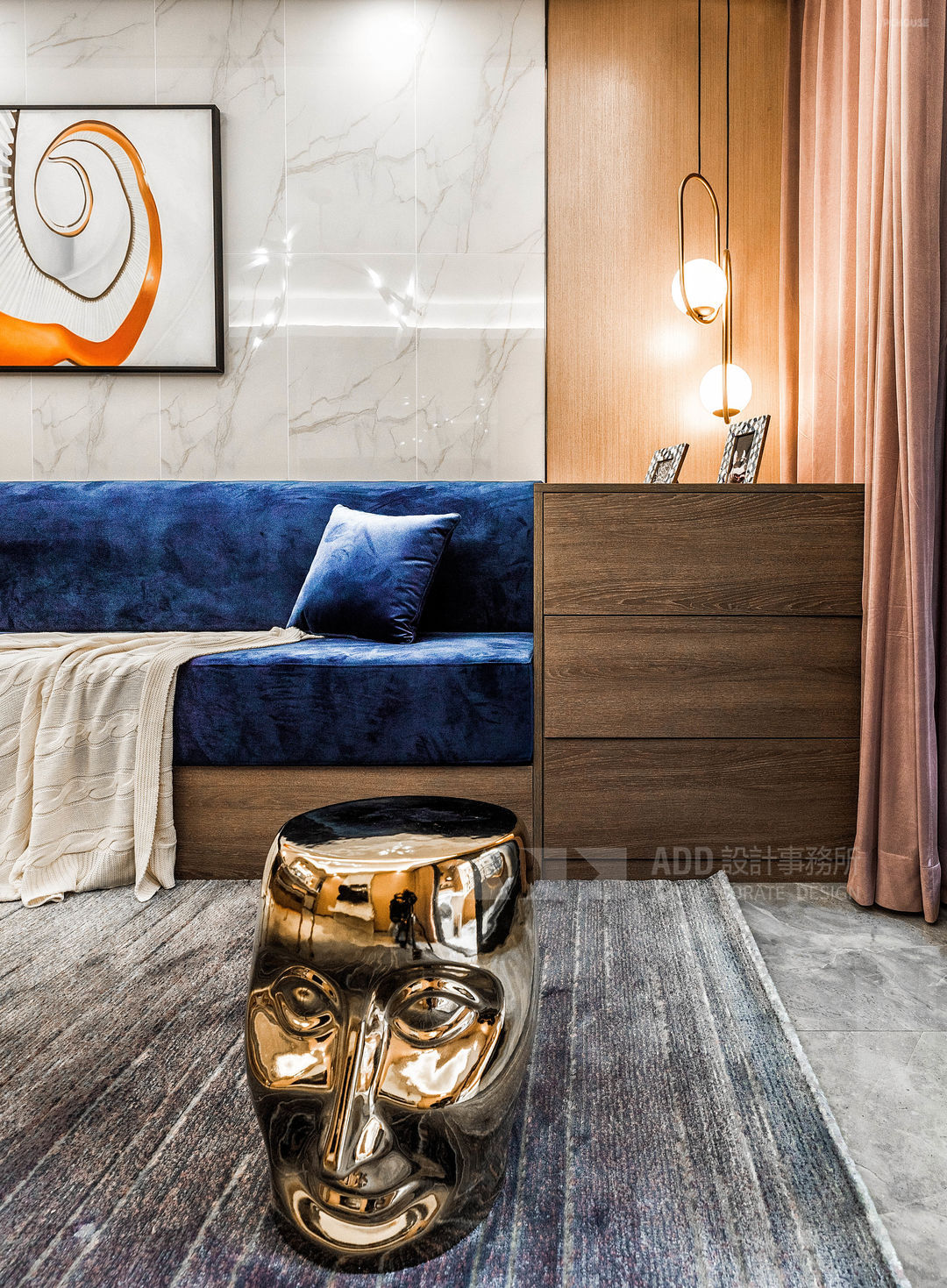 金丝绒布艺的沙发坐垫为空间注入了新的灵魂。不同层次的黄色将轻奢的质感推向极致。