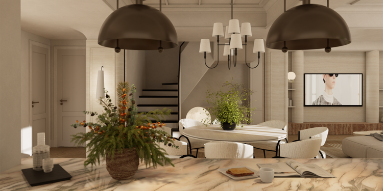 吧台、餐厅、客厅各个功能区点阵式的散布在空间里。既相互联系又相互独立,活动的场景在不断地发生、互动