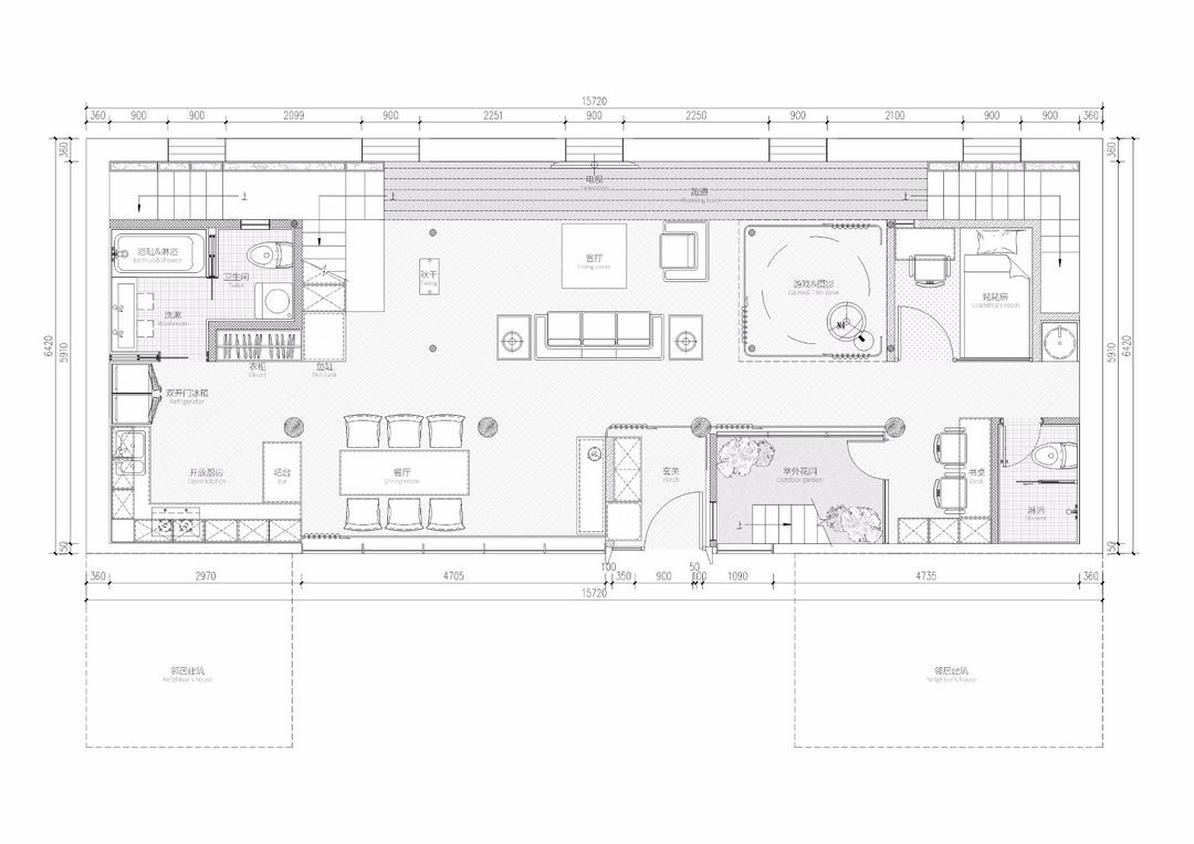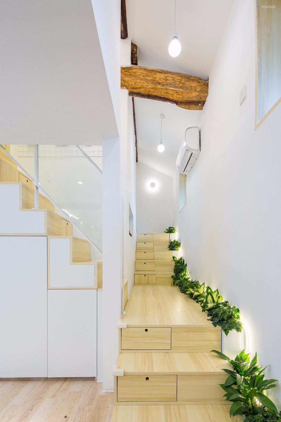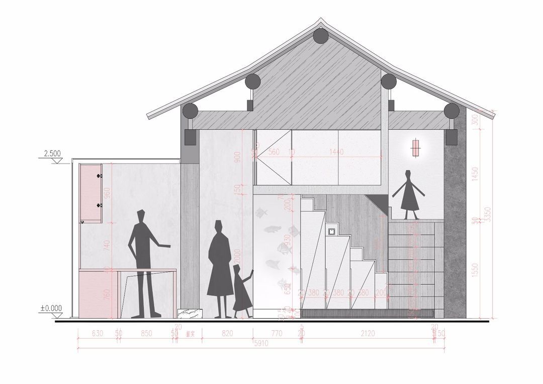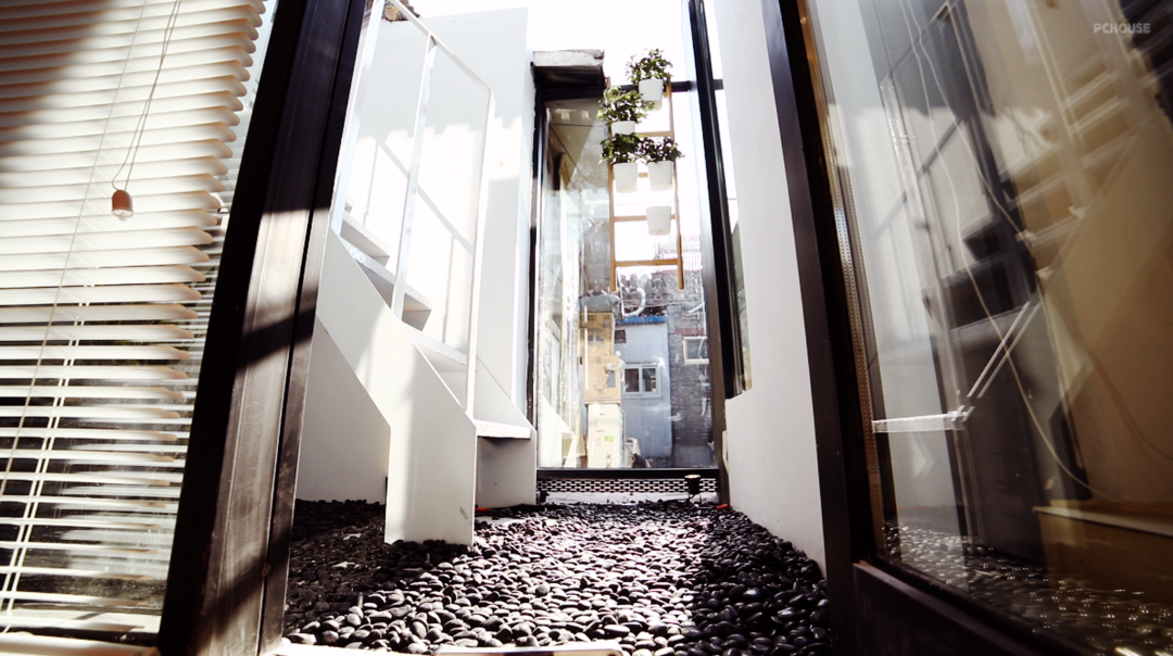 改造对各空间进行了动静划分和功能整合,夫妻,儿童和老人都有各自的工作学习和休憩娱乐区域。正房中间用客厅作为分隔和集散,两侧尽端配备独立卫浴。南侧玻璃柱廊依次排列着厨房餐厅,玄关,室外庭院和书房。袅袅炊烟和庭院信步透过玄关的窗洞相映成趣。北侧交通空间提供大小九嬉闹的跑道,跑道两端是暗藏橱柜的楼梯,通往主人卧房和儿童卧房。
