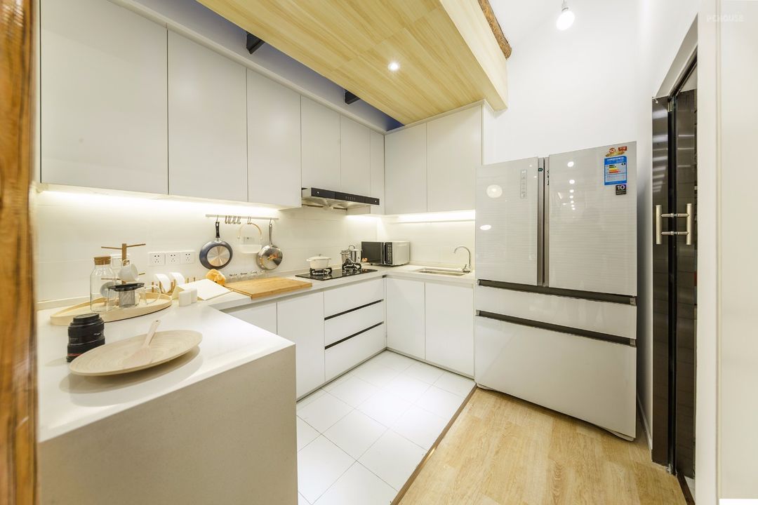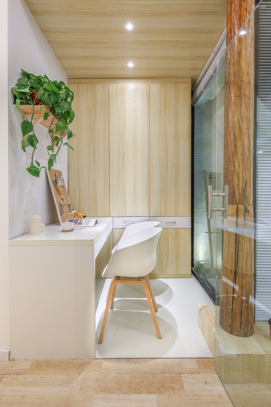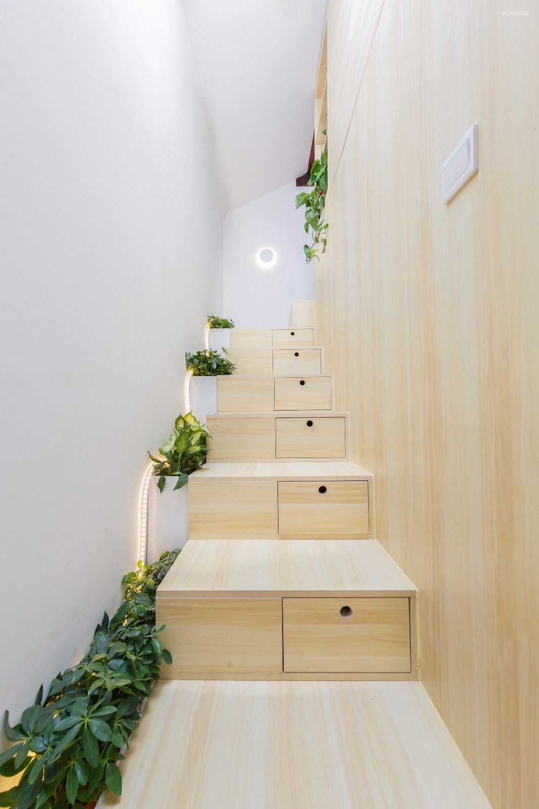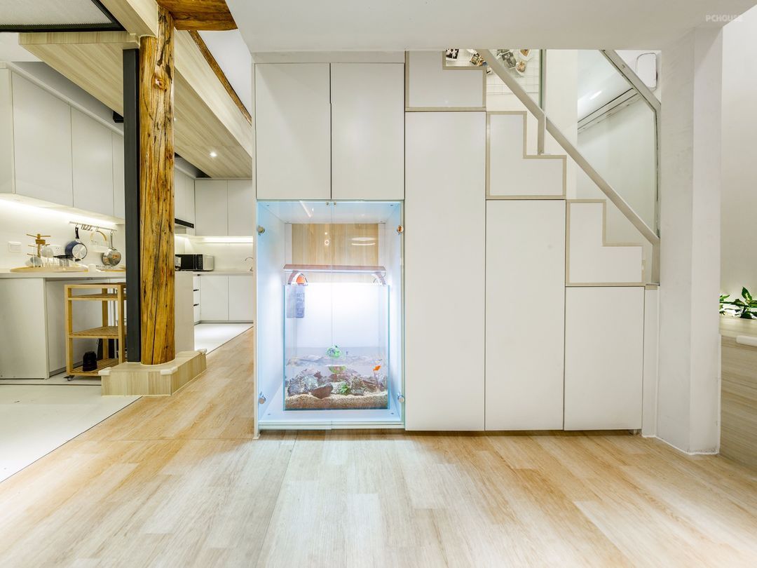 改造对各空间进行了动静划分和功能整合,夫妻,儿童和老人都有各自的工作学习和休憩娱乐区域。正房中间用客厅作为分隔和集散,两侧尽端配备独立卫浴。南侧玻璃柱廊依次排列着厨房餐厅,玄关,室外庭院和书房。袅袅炊烟和庭院信步透过玄关的窗洞相映成趣。北侧交通空间提供大小九嬉闹的跑道,跑道两端是暗藏橱柜的楼梯,通往主人卧房和儿童卧房。