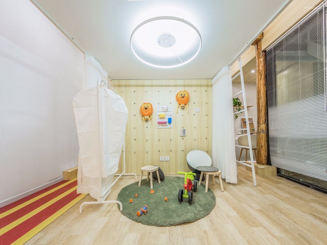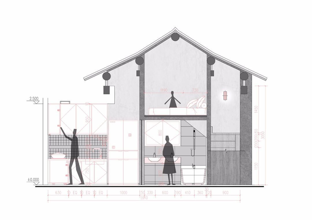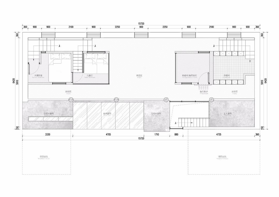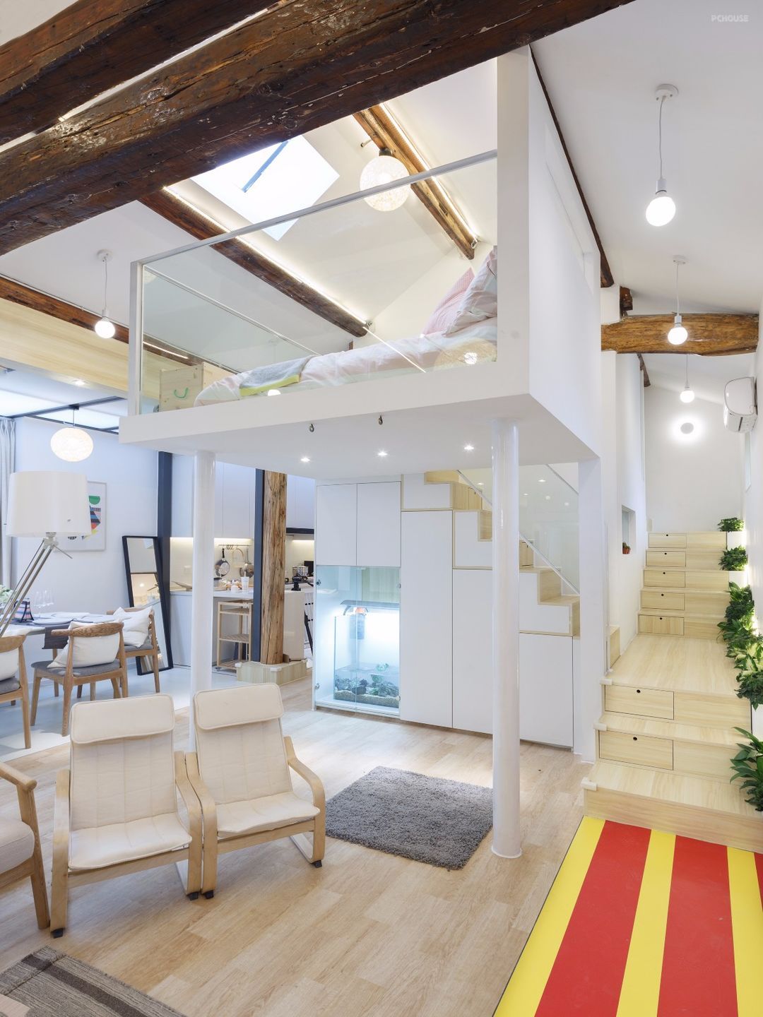 设计利用的坡屋顶屋脊高度,在客厅两侧挑空放置夹层。解放底层空间,用于儿童游乐及摄影。架空所有休憩空间,父母卧房和儿童卧房居西侧,方便看护。姥姥卧房和客房居东侧,互不干扰。图中为联系父母卧房和儿童卧房的“猫洞”及屋顶天窗