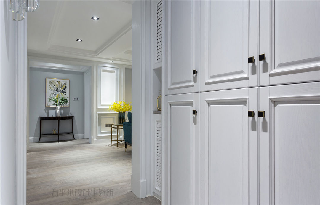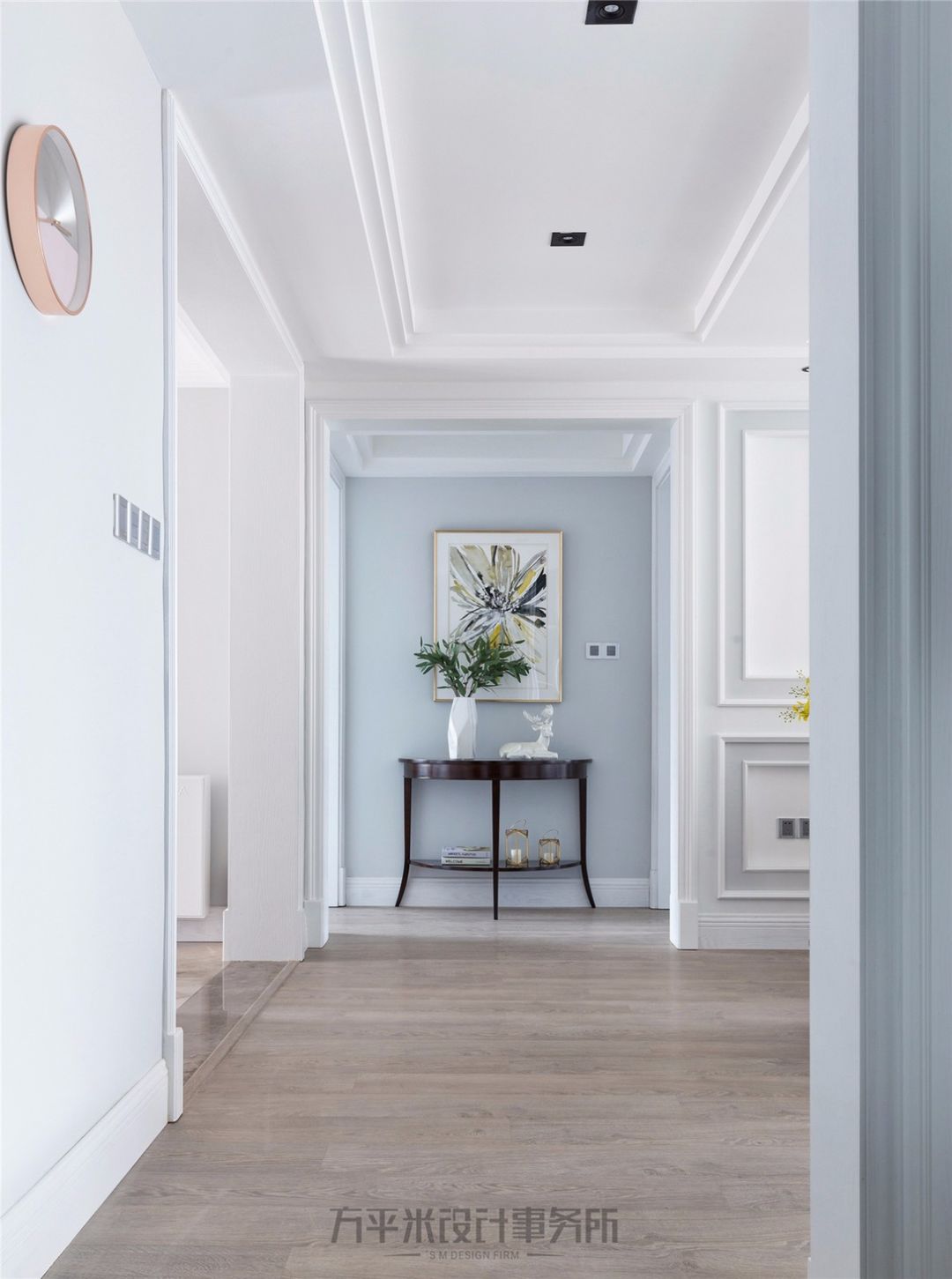 走廊尽头的繁花装饰画作,推门入户即映入眼帘,为全屋淡雅清新灰蓝色调带来芬芳甜美的写意装点。