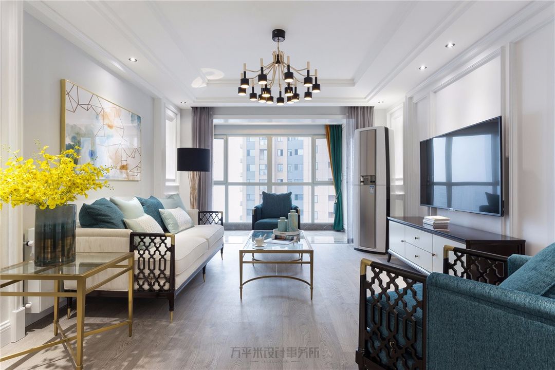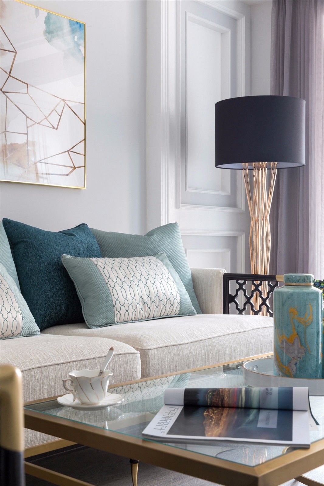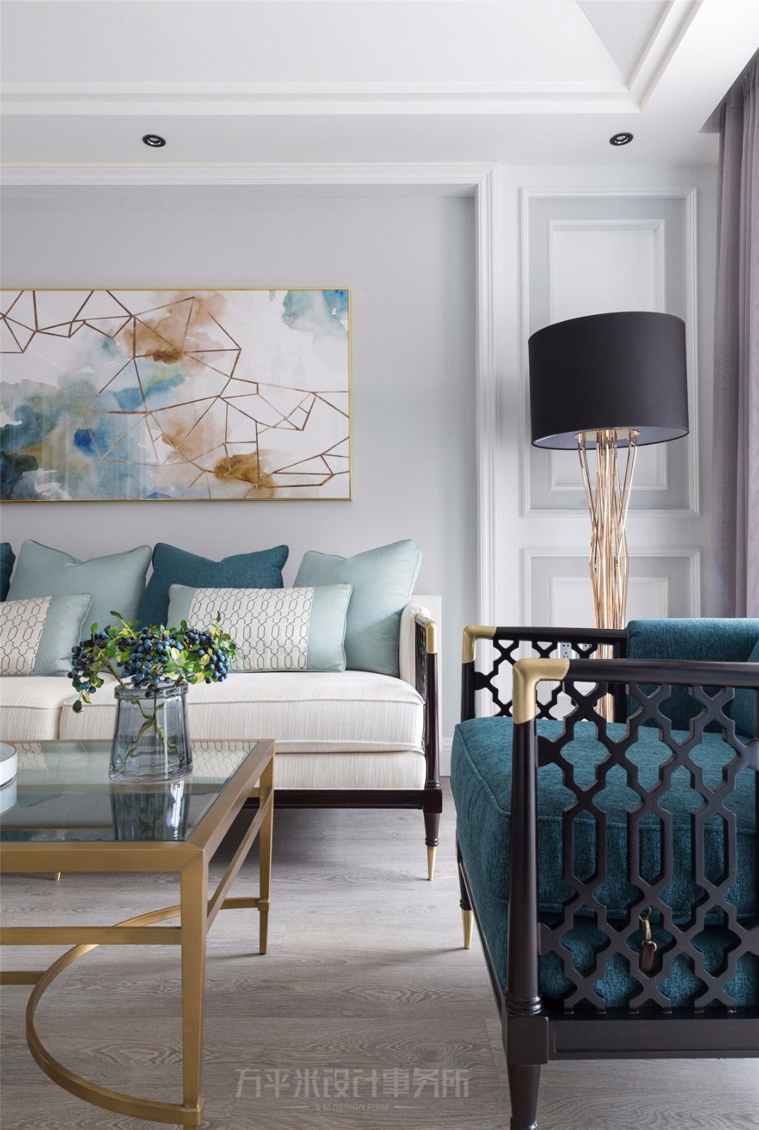 金属围镶、实木雕花的布艺沙发造型优雅、触感柔软,给予居住者放松舒适的观影感受。