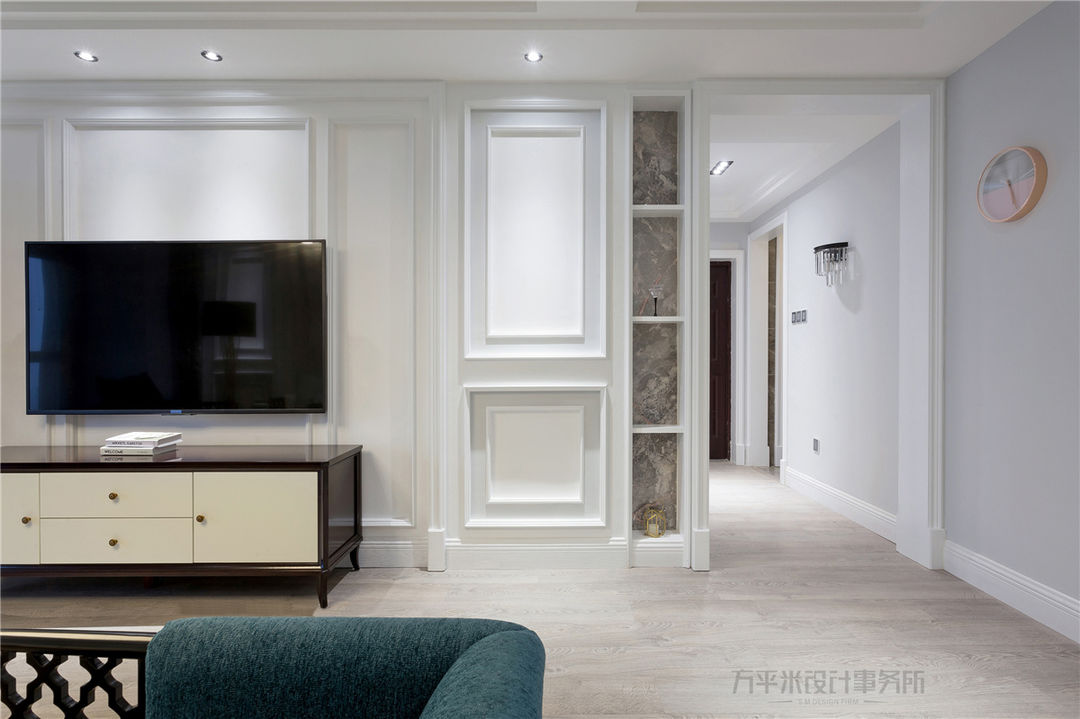 电视背景采用沙发背景相似线框几何型分隔,在同一空间内互为呼应。