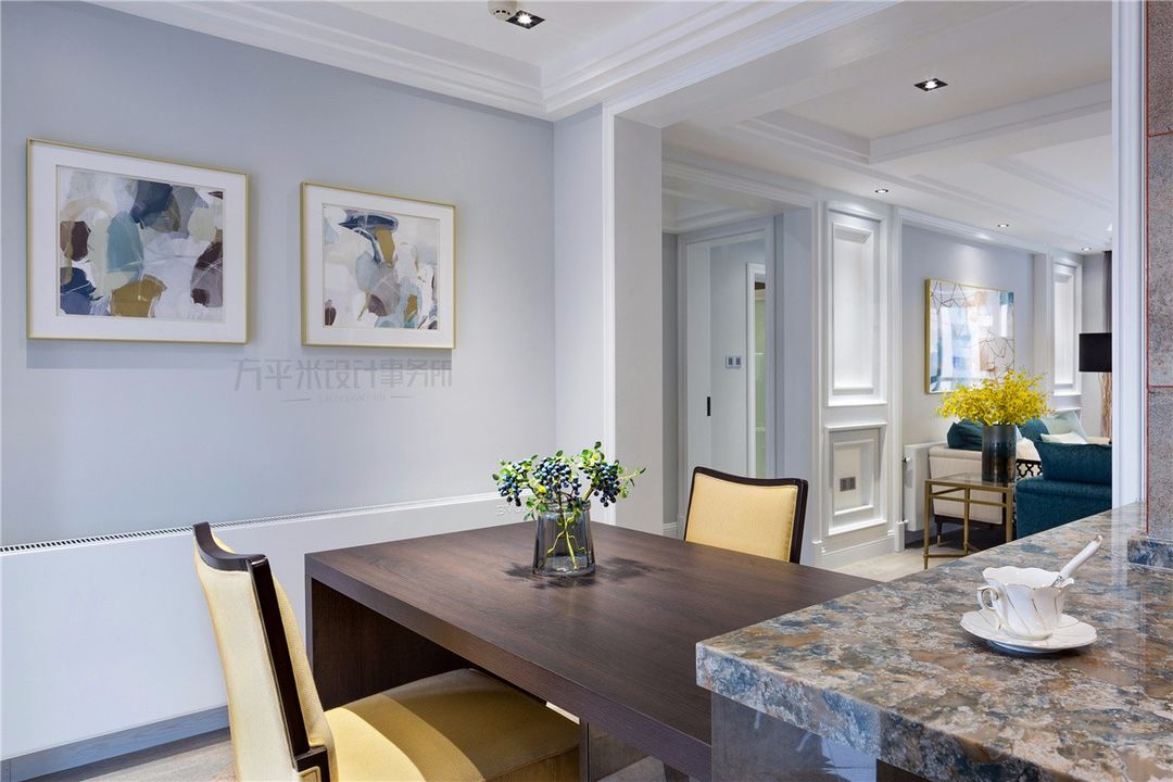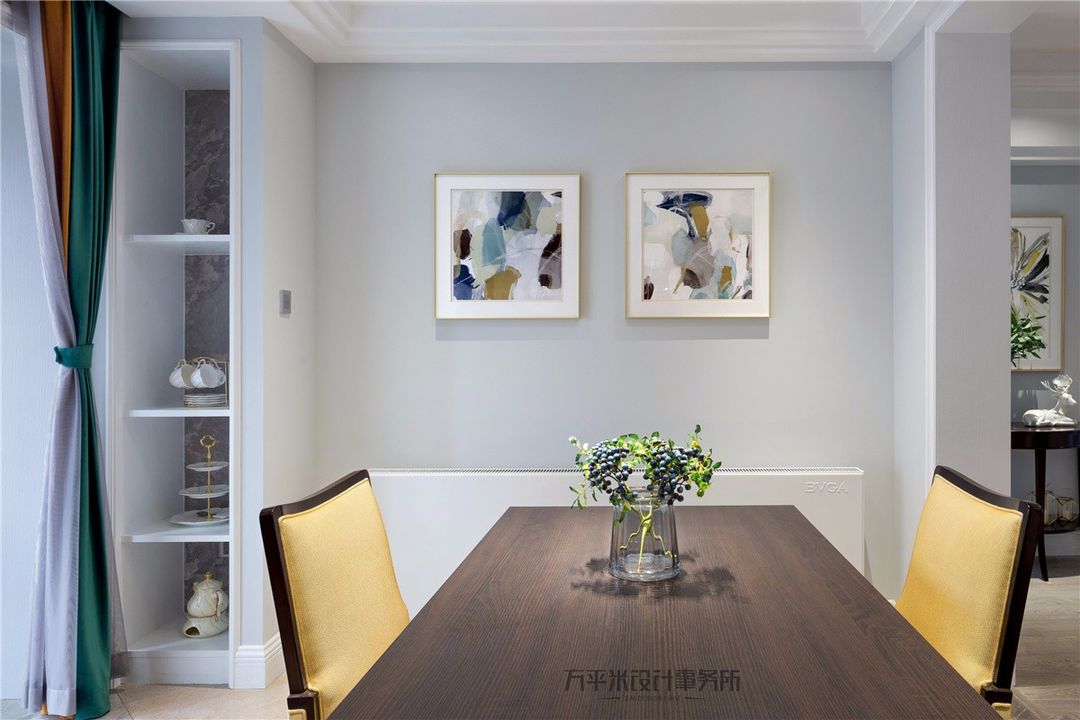 内嵌式开放展示柜为餐厅提供便利收纳,采用灰纹光洁大理石为底,便于打理。