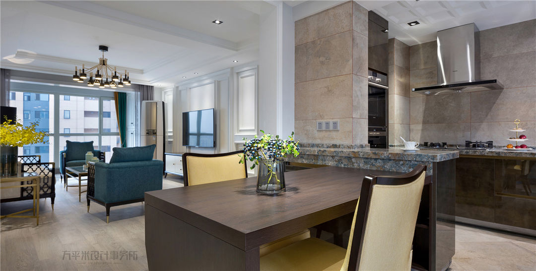 开放式厨房与吧台一体式餐台相结合,使原本狭窄的餐厅及厨房形成统一的功能区间,相邻空间均得到释放。