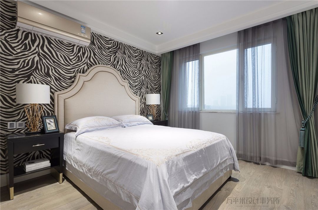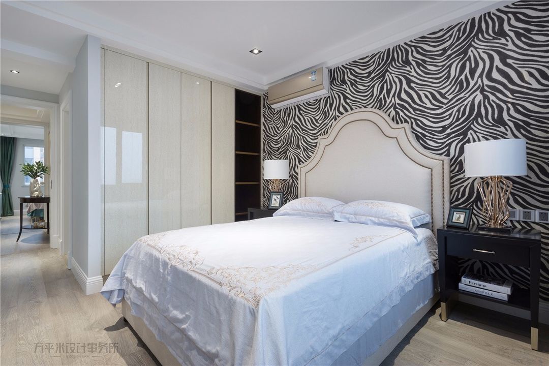 淡雅米色系床及满墙衣柜的纯净色块简洁清爽,相配黑白斑马纹墙面所营造的现代时尚感。