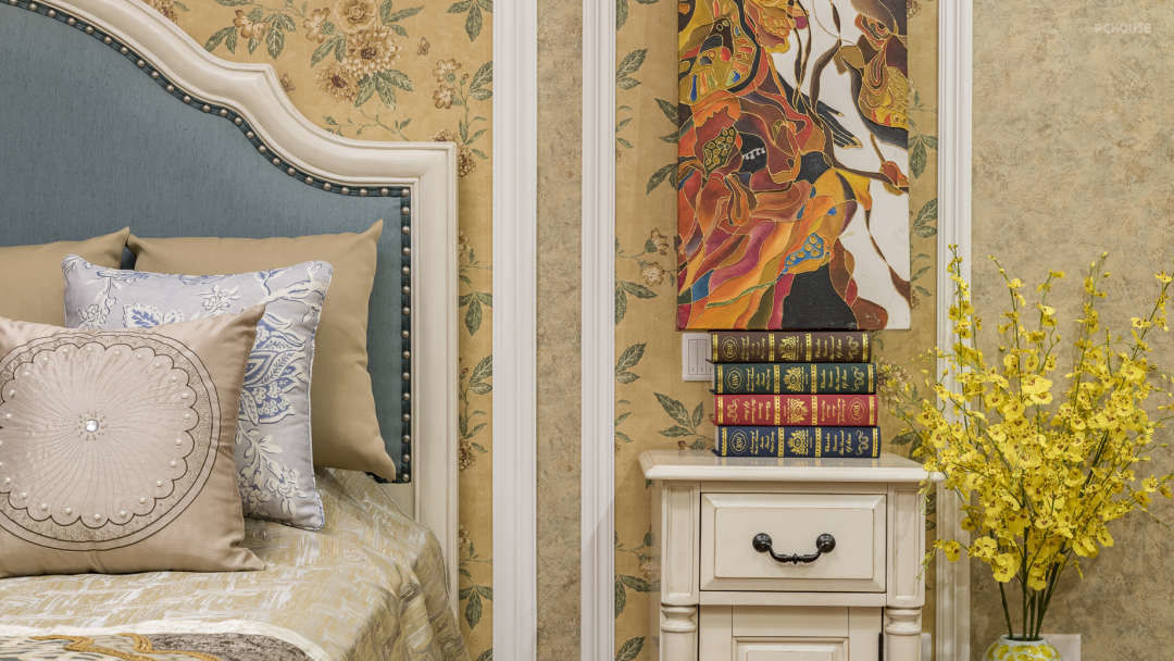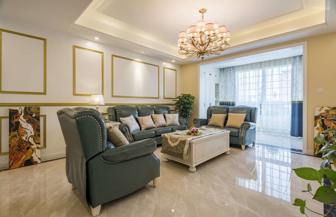 沙发墙满墙护墙板,面刷油漆的工艺。木质线条来突出欧式的情调。男主人对复古金色情有独钟,所以现场调油漆也是费了不少心思。