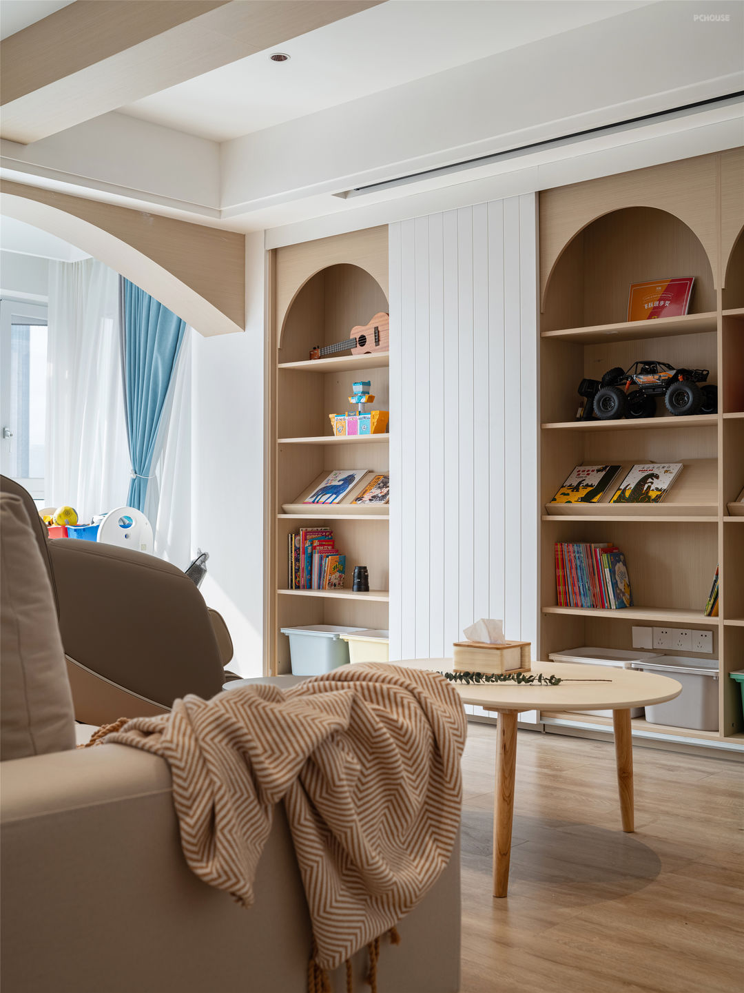 屋主平时不希望小朋友多看电视,所以客厅舍弃了电视机,做了升降投影幕布,用作平时的观影娱乐。