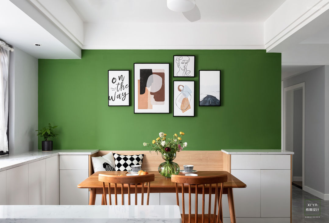 餐厅的卡座,在增加储物的同时,还释放出更大的通道便于出入厨房,让这个空间更大化的利用,更好的满足女主人对于台面和储物的需求。