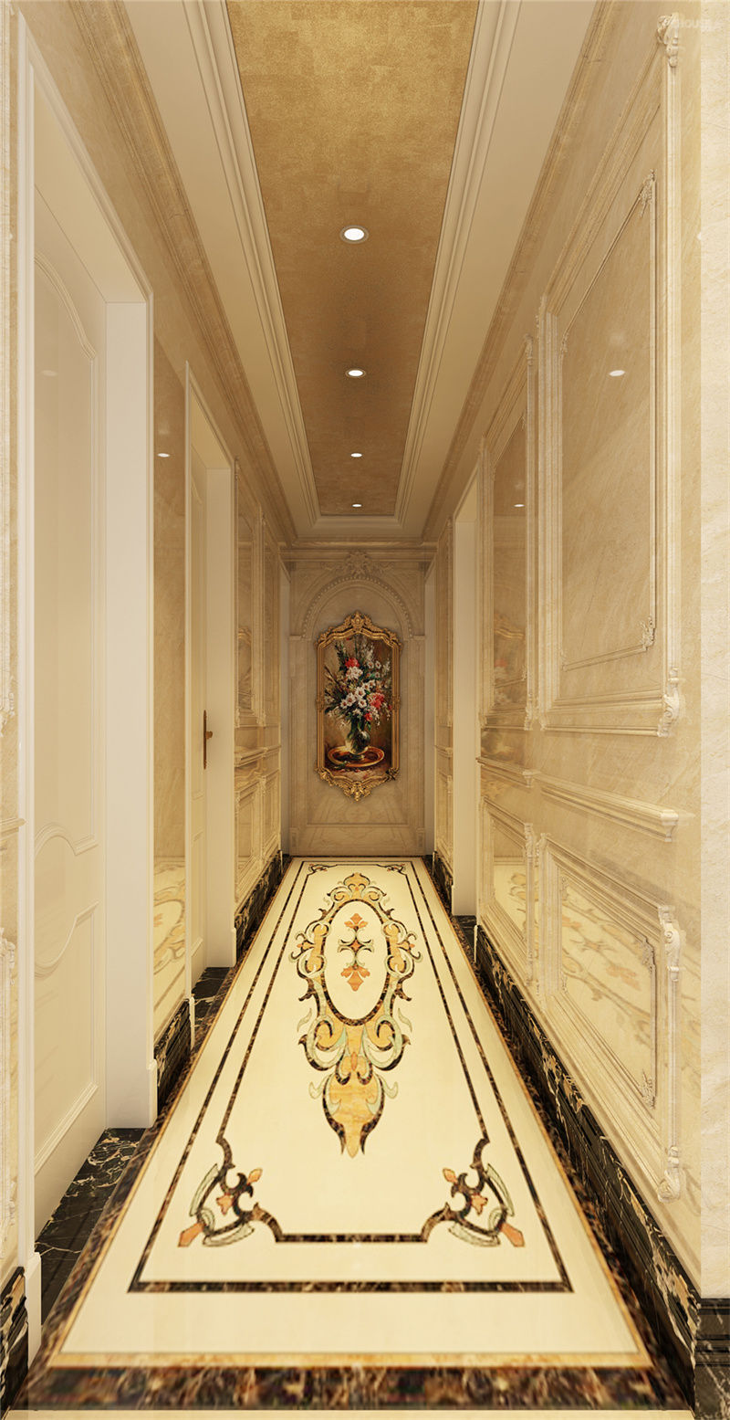 描金、雕花正是欧式风格所在,厚重的画框与繁复的线条相互匹配。过厅、门厅作为空间之间的过度区域,运用了欧式豪华大理石造型,让拱门、吊顶、地面拼花完美的衔接。