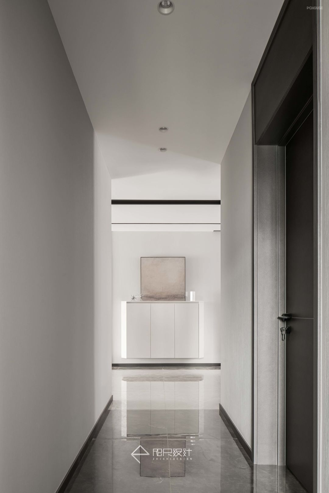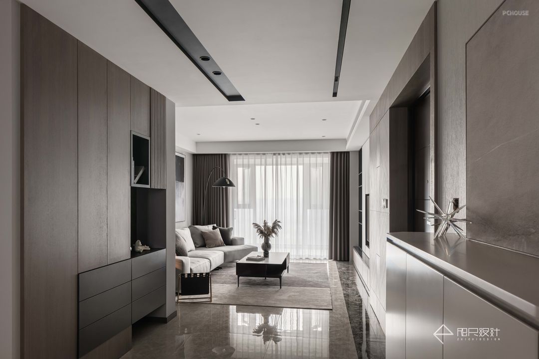 设计亮点:入门处打造了端景柜、和U型衣帽间形成了双面收纳柜;客厅隐形门工艺复杂,都为师傅们现场制作,给这个简洁大气的空间增添一丝乐趣。