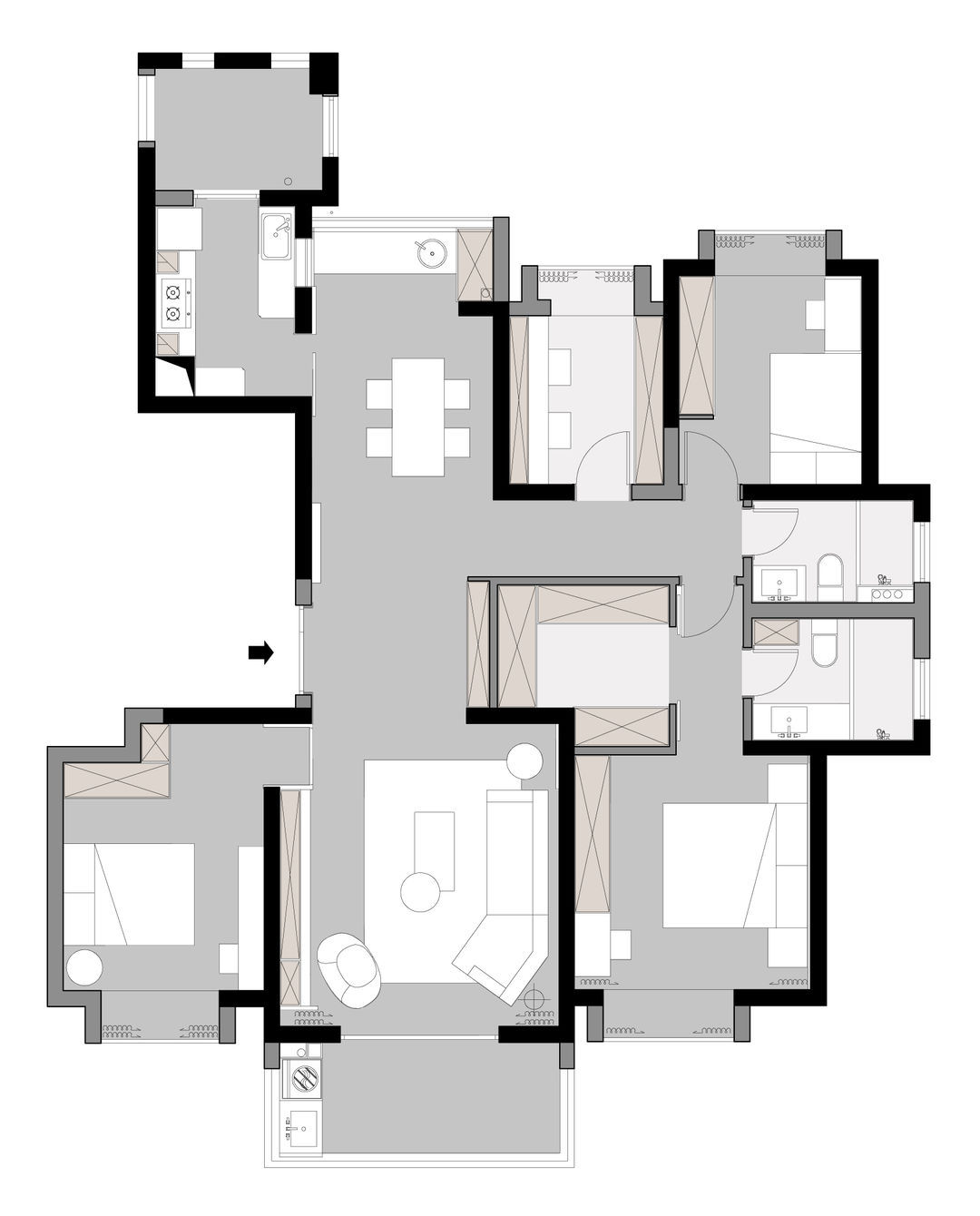 入户左边打造悬空式鞋柜、扩展室内收纳空间,解决无玄关户型的尴尬。 入户对面打造端景台、与衣帽间形成双面收纳柜,增加入户仪式感、将储物量最大化。 客厅电视墙和收纳材质整合在一起,并制作隐形门融入电视背景墙。 将北阳台并入餐厅、制作西厨,中西厨房用玻璃移门隔开、丰富餐厨功能。
