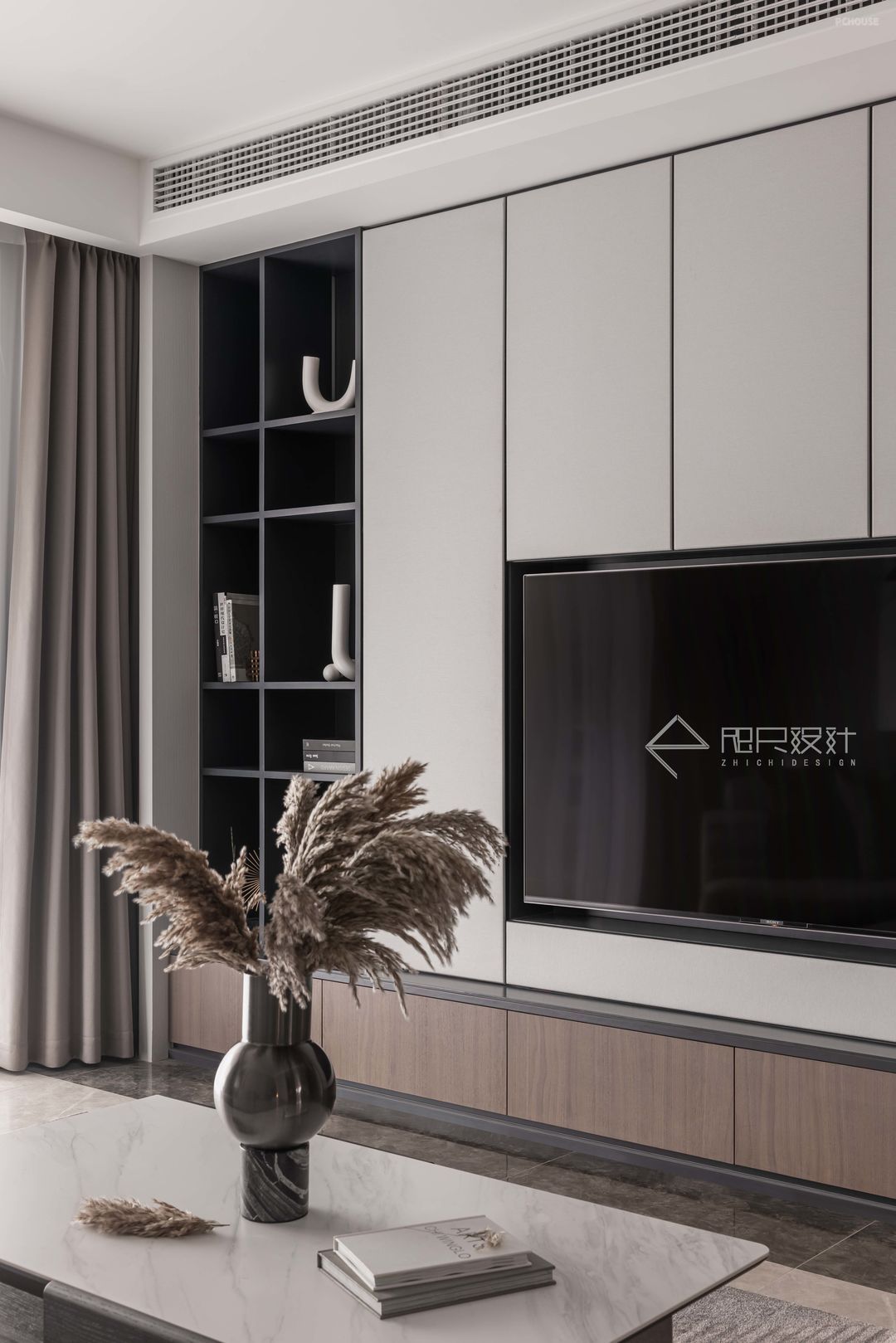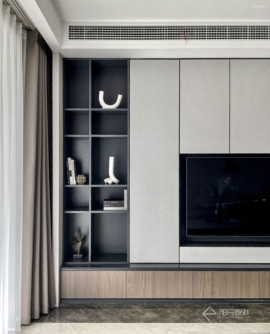结合电视墙、收纳柜的一体化组合柜,既可娱乐又兼具收纳功能,墙布包裹的收纳柜、让材料统一,电视机嵌入其中、维持着居家氛围的简洁大气。