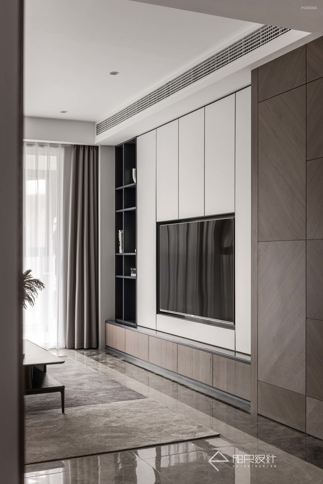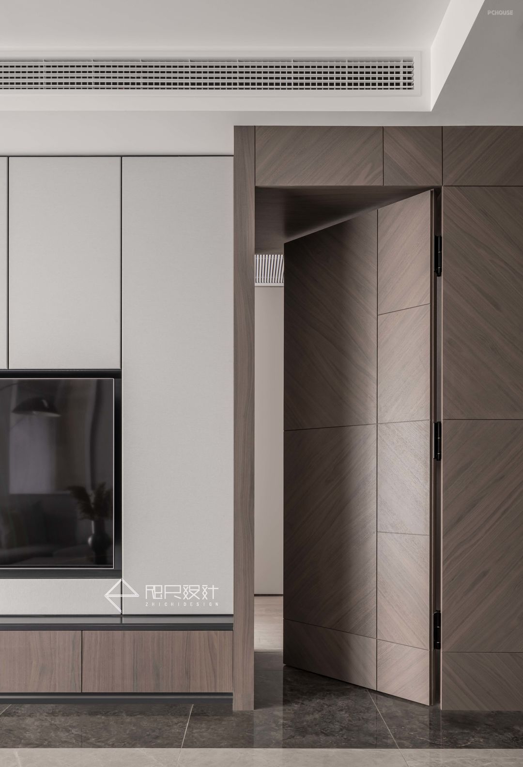 现场制作的木饰面隐形门、与电视柜材质保持一致,可以让电视背景墙起到视觉上的延伸作用,增加空间趣味保证隐私。