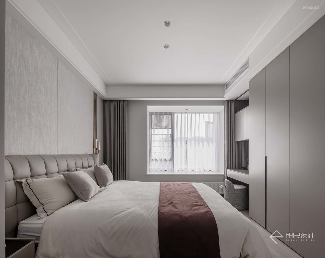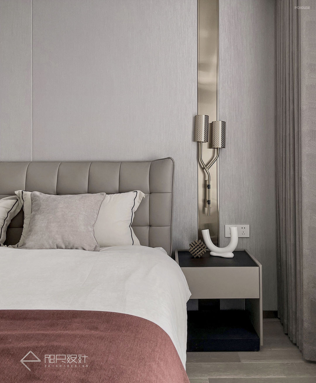 主卧带着雅致的轻奢感,用金色不锈钢装饰的床头更显时尚、搭配金色壁灯提高空间的设计与美感; 线性灯和射灯让灯光的分布均匀,简约的造型和光影效果、反而更能呈现出不一样的视觉感。