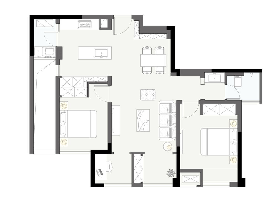 1、次卫与厨房打通形成一个带中岛的大厨房,并且向次卧借用些许厚度,嵌入两台冰箱;