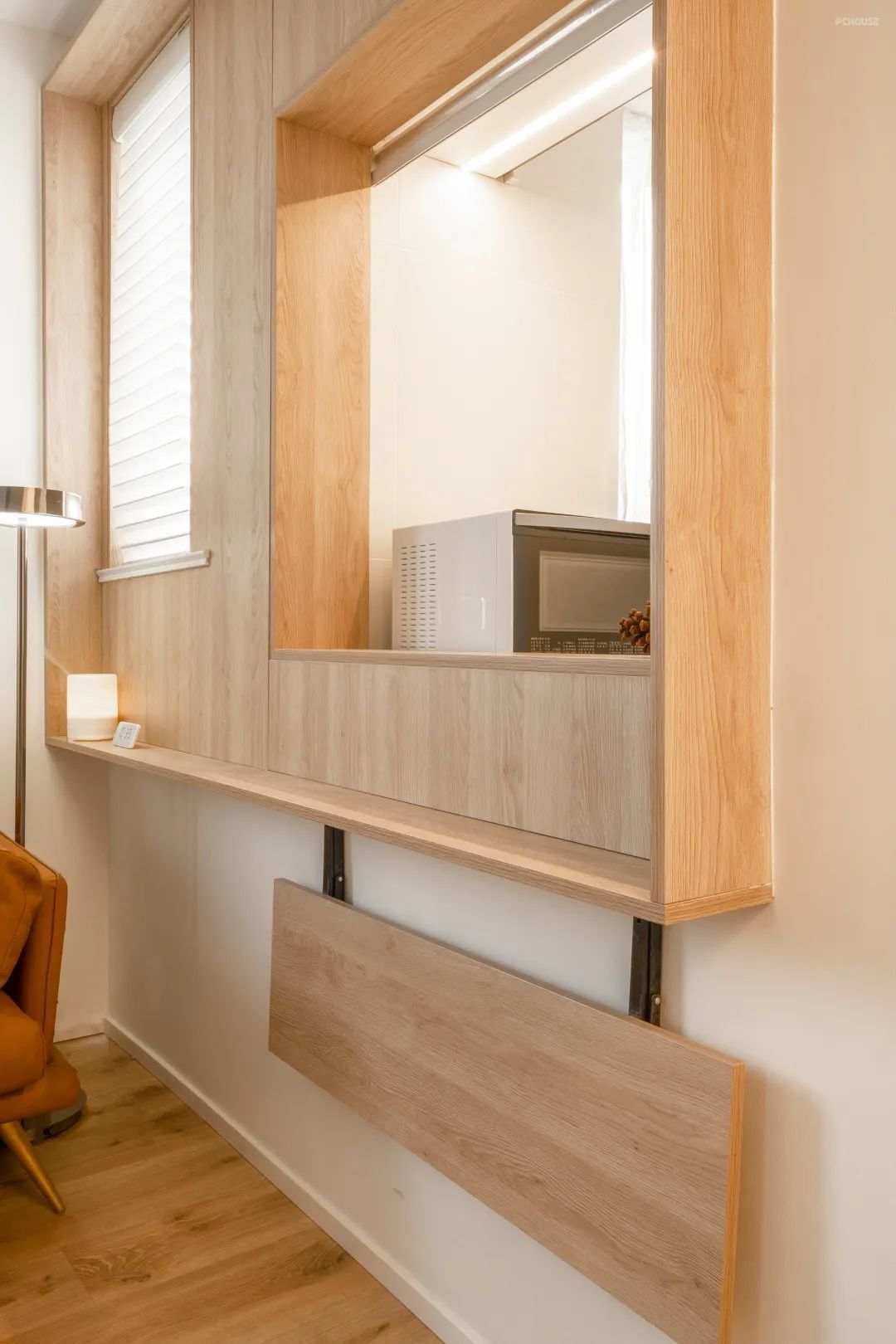 设计师对厨房与客厅之间的实体墙壁进行了调整改造,在墙体上打通了一扇室内墙洞,打破了视觉上的硬性阻碍,延展了客厅的视觉通透性,也增加了小空间厨房的开阔感。