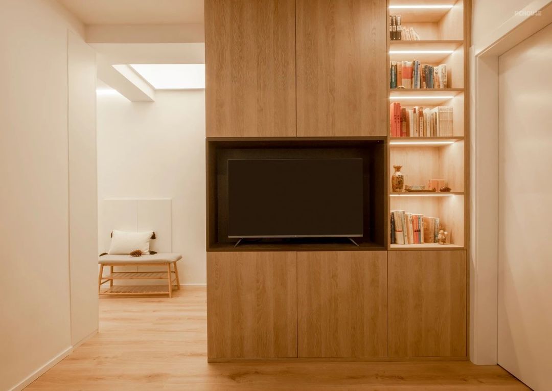 半开放式的隔断展示柜,即是分隔墙体,也是收纳空间。将入口玄关与客厅分隔开来,一侧连接走廊,一侧通向客厅。柜体的布局合理划分出储物空间,容纳了电视柜的功能性,又可以方便摆放屋主喜爱的书籍及小摆件,同时也是右侧儿童房的书柜的延伸。
