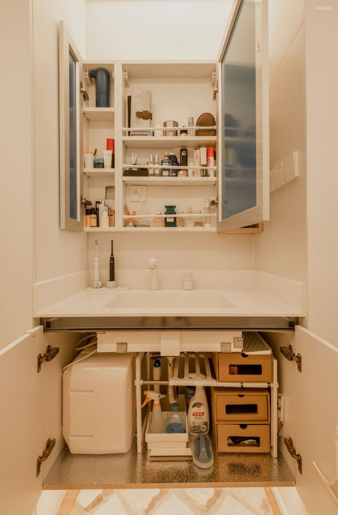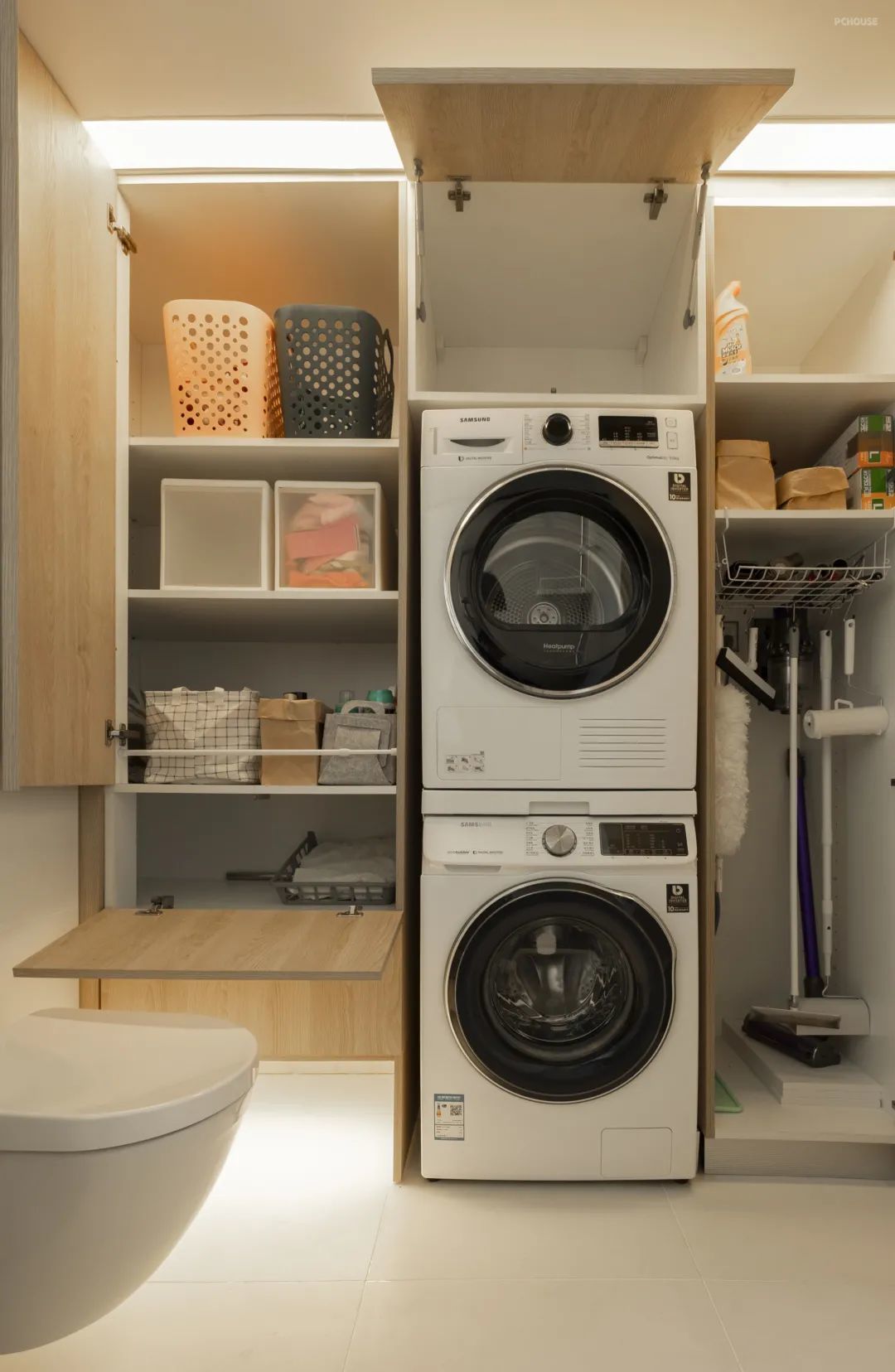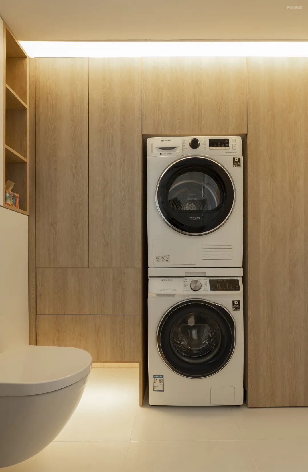 在有限的空间之上实现了卫生间的干湿三分离——洗手池、淋浴间、马桶间各自分隔。满足了厕所空间的干爽整洁,同时在一侧设计了定制式收纳柜,将洗衣机及烘干机内嵌,大量储存空间方便放置各类清洁用具。