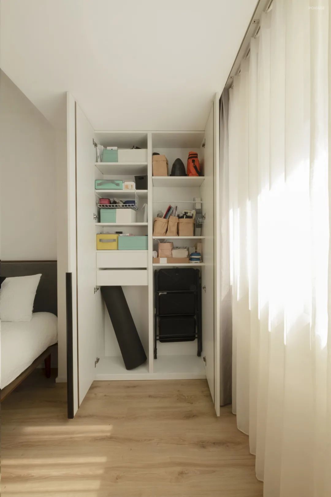 主卧设计了三面收纳,合理地利用起每一处空间。床尾位置配置了 2.2 米左右的衣柜储物空间,不仅可以收纳各类衣物,同时也可以将旅行箱、吸尘器等杂物藏入其中,几扇柜门,隔离起生活的喧嚣与杂乱,让空间瞬间轻松起来。