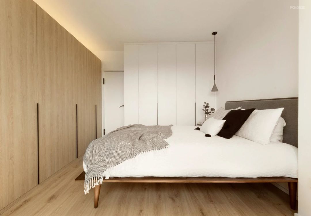 主卧选用白、灰、木质色调的搭配,舒适温馨的格调,自然通透的气氛。木地板与原木色调的柜门,带着自然的肌理感,与卧室一侧简洁、高包容性的白色墙面相互呼应,让空间更具呼吸感,质感满满。