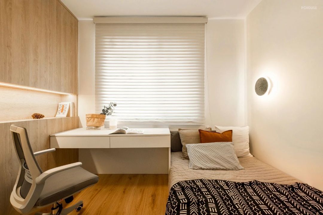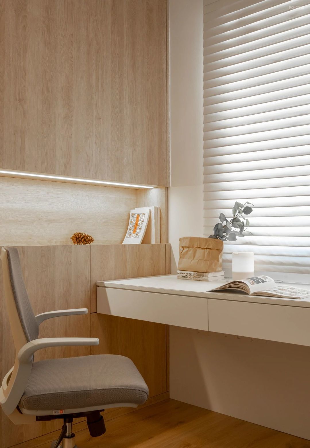 儿童房同时满足了作为卧室以及书房的双重功能,简洁干净的原木色调,极大地提升了空间舒适度。哑光材质的家具和设计为孩子的学习提供了安静不聒噪的环境,也为睡眠提供了轻松宁静的氛围。