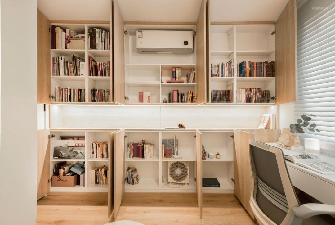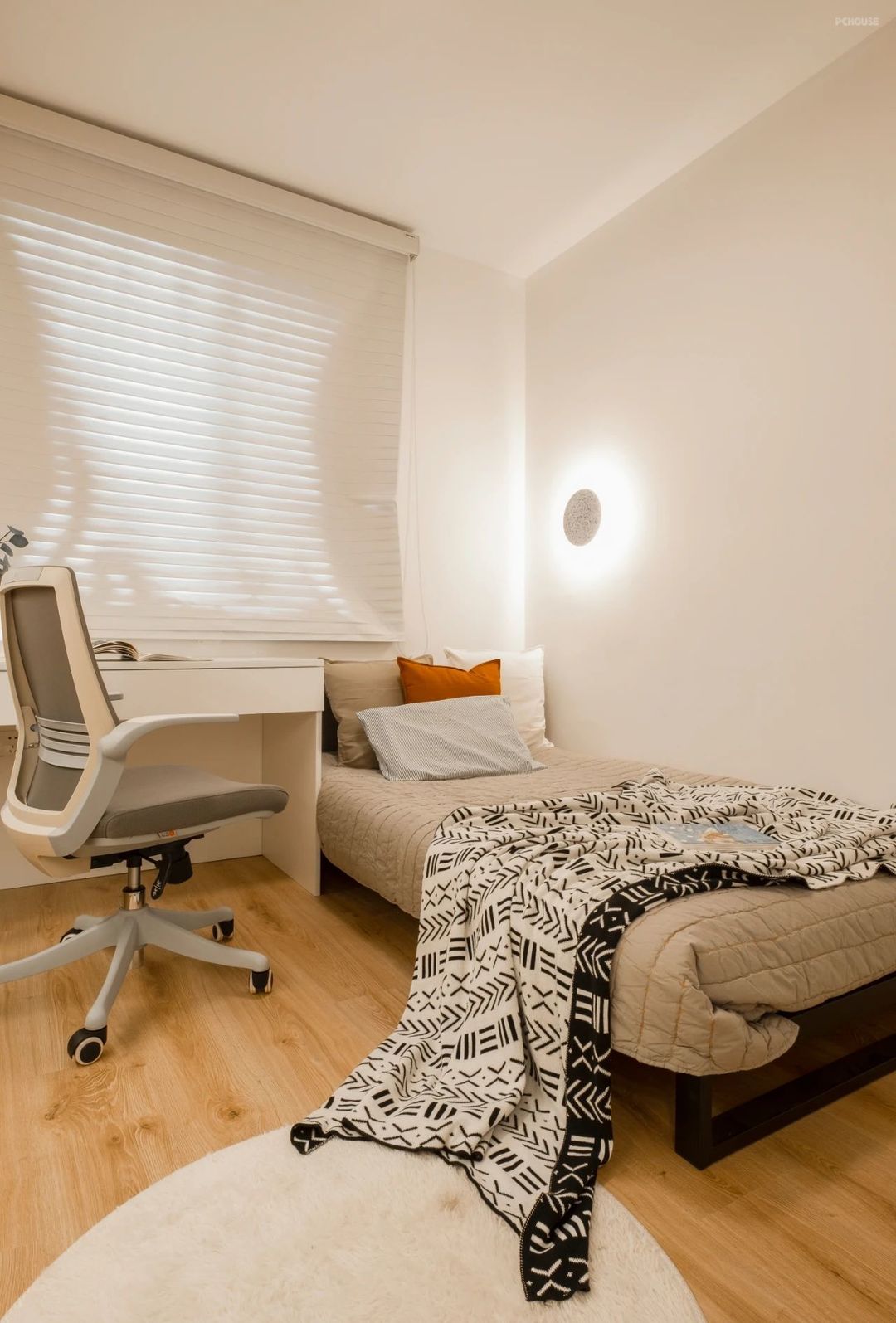 次卧与起居室相连,考虑到孩子的成长以及空间使用,设计师将两个空间的功能性相结合,既满足孩子不同成长阶段的需求,又兼具书房、藏书等功能。