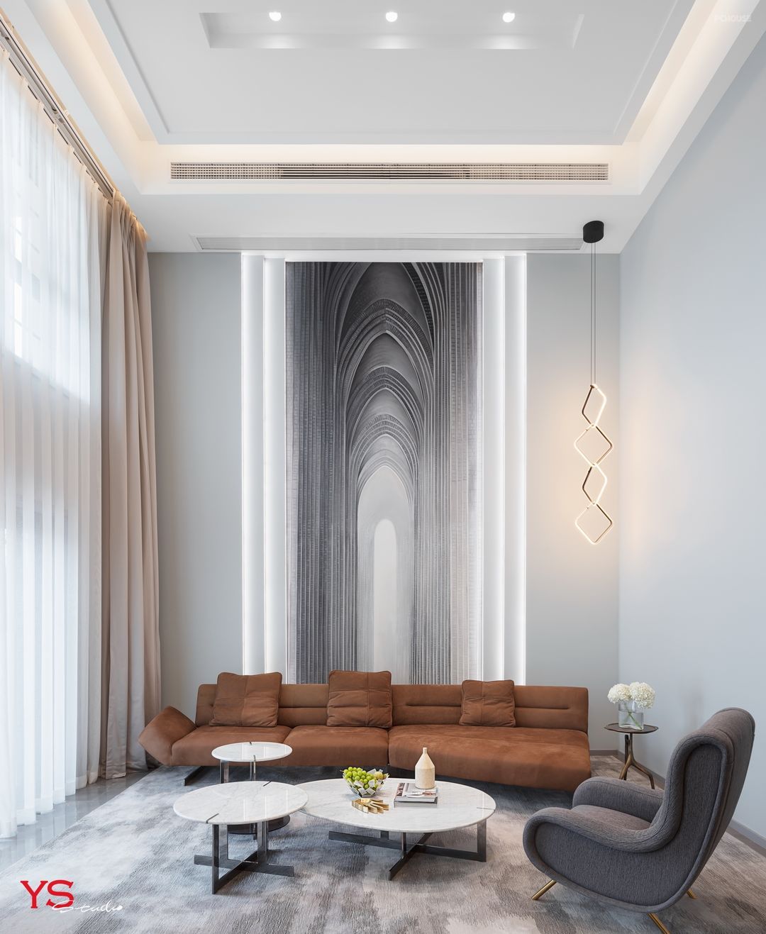 RECASA高低错落的茶几组合;FLOS的吊灯,