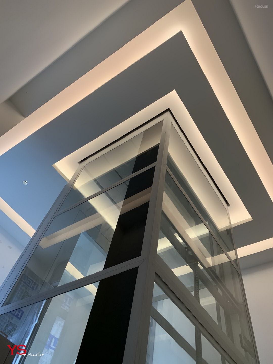 来自玻璃电梯和地面砖的投影;顶面、墙面、地面,三面的维度变成了多面几何菱角。