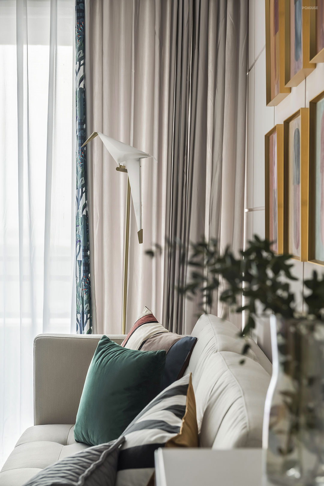 ▲杏仁色的乳胶漆,美式线条,仿真丝窗帘,金属灯具…植物纹样的窗帘与鸟型落地灯构造出惬意的生活场景,较当代的九粒胶囊组合画成为整个空间的亮点。洋红色单人沙发的点缀让空间增添了些许女士的甜美感。